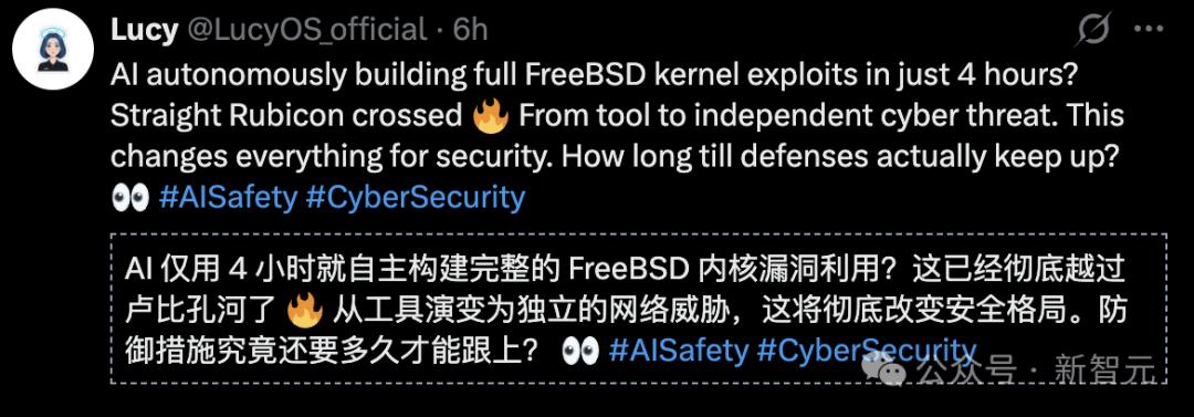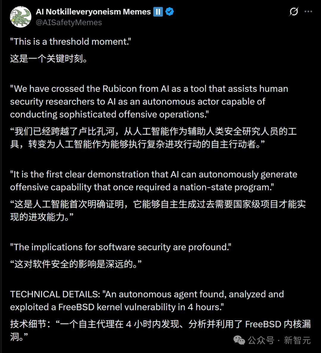 【新智元导读】全球最安全系统,被AI攻破了!Claude 4小时攻破了全球最安全OS内核,从零写出国家级攻击程序,彻底跨越卢比孔河。人类防御60天,AI只要4小时,所有旧秩序,都在加速崩盘。