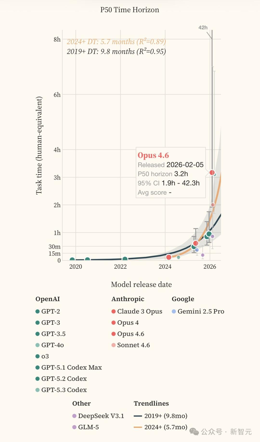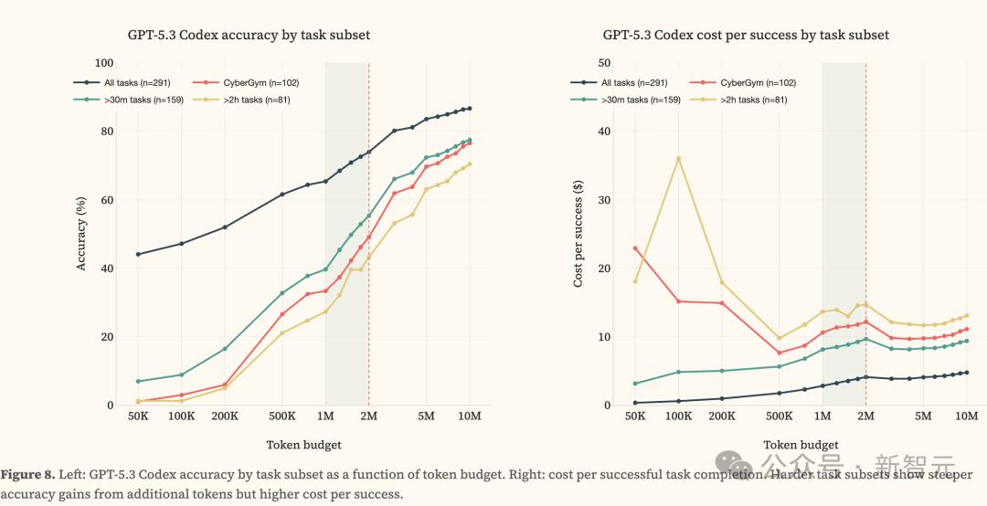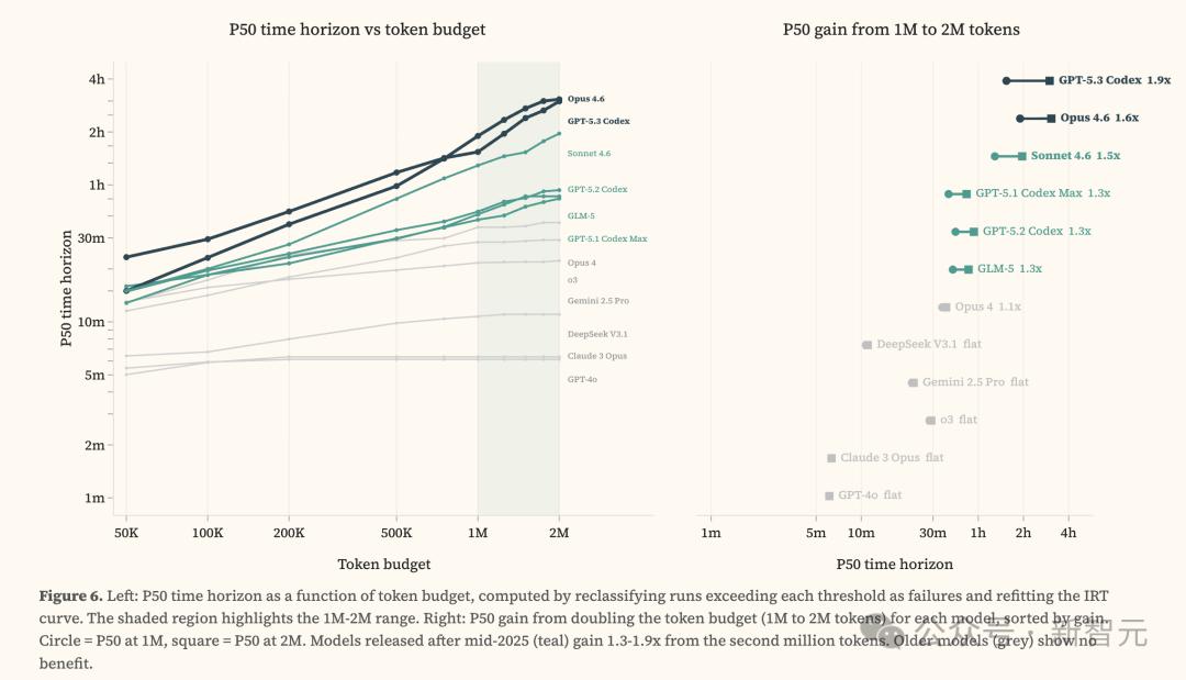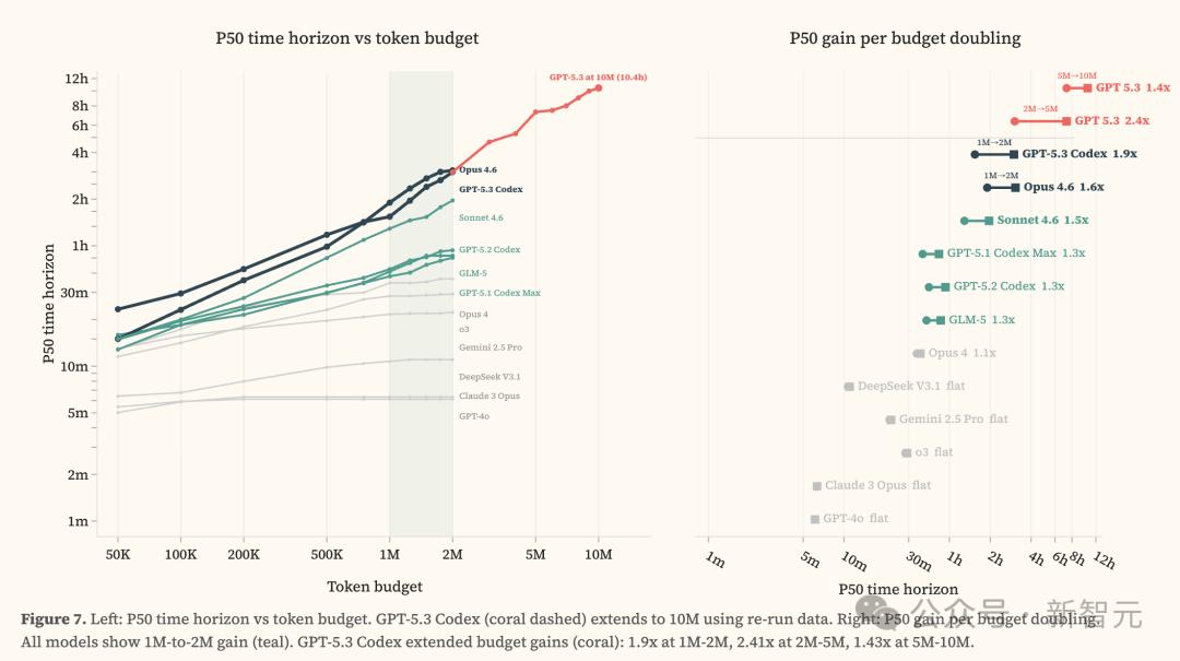 GPT-5.3 Codex和Opus 4.6,在2M token预算下就50%成功率干掉人类专家3小时任务。