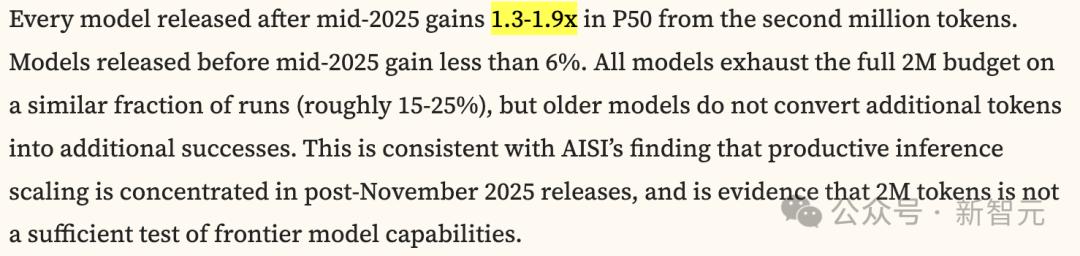 2M token严重低估真实能力,后2025模型在1M-2M token间P50提升1.3-1.9倍!