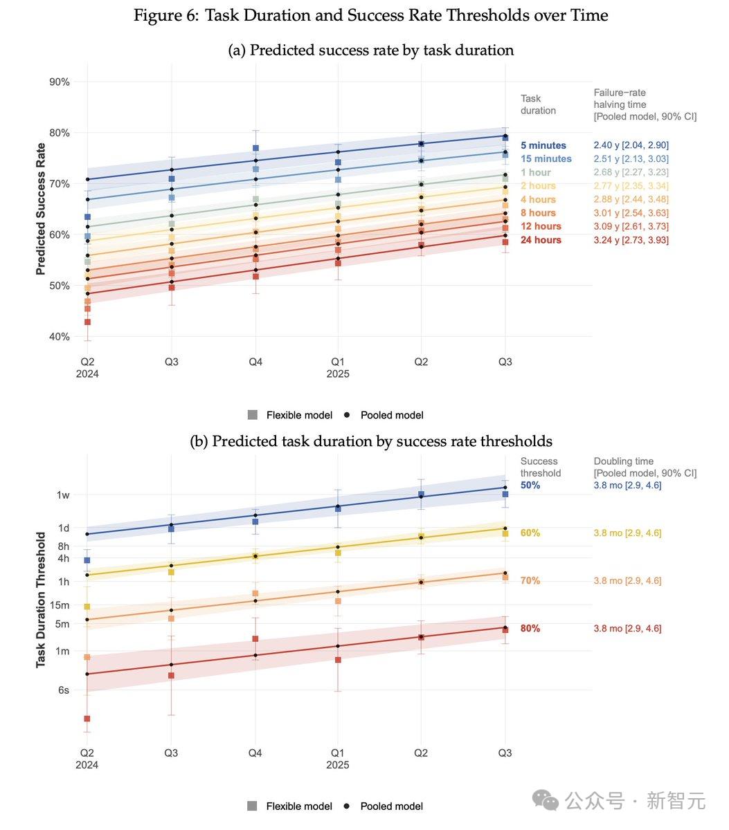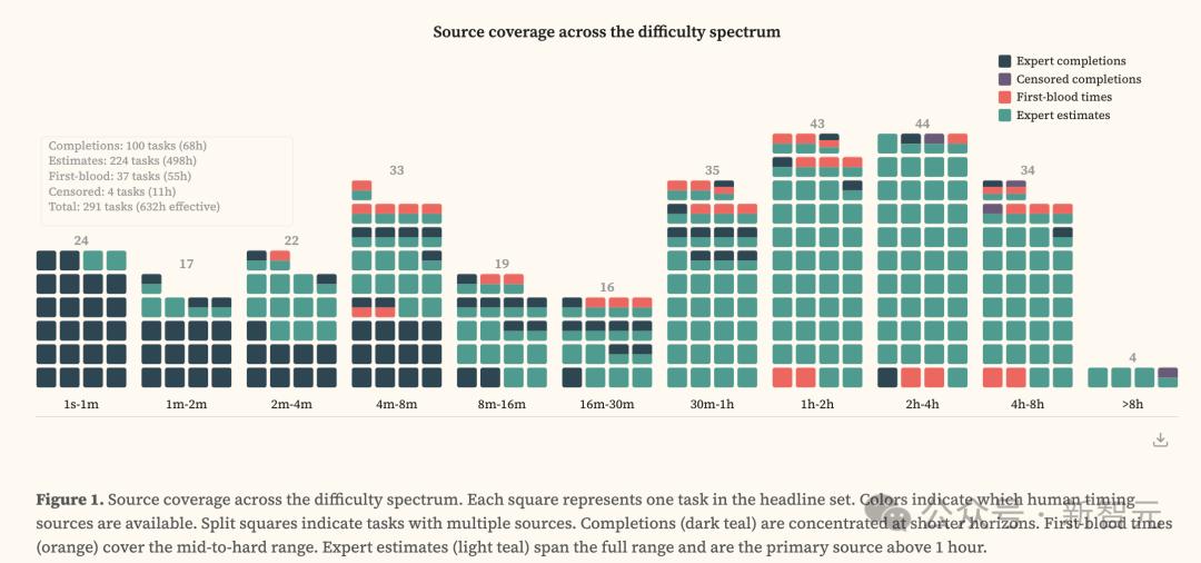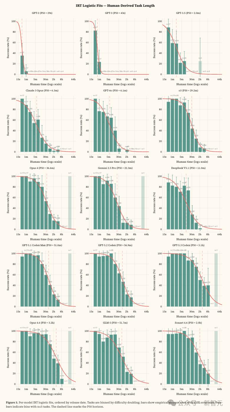 Lyptus把每个任务先标上「一个熟练人类专家通常要花多久完成」,再看模型在不同难度上的成功率;