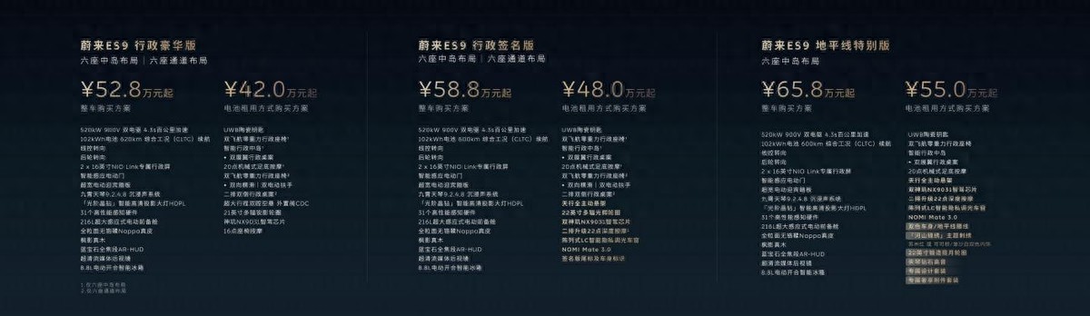 科技行政旗舰SUV——蔚来ES9今天在杭州正式发布并开启预售。ES9是蔚来十一年体系创新的集大成之作,是智能电动行政旗舰SUV品类的开创者。ES9行政豪华版预售价528,000元起,采用BaaS电池租用方式购买,预售价420,000元起;行政签名版预售价588,000元起,采用BaaS电池租用方式购买,预售价480,000元起,地平线特别版预售价658,000元起,采用BaaS电池租用方式购买,预售价550,000元起。