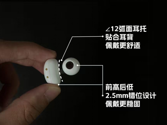 耳机的佩戴设计很有特色,单耳只有 4.5g,戴上几乎感觉不到重量,搭配 2.5mm 错位设计,耳机形成前高后低的佩戴状态,戴着自然贴合耳背,耳部压力分布均匀,再加上 12°弧面耳托支撑耳背,哪怕久戴不硌不胀,通勤、走路、轻度运动都牢牢固定,不会掉落。
