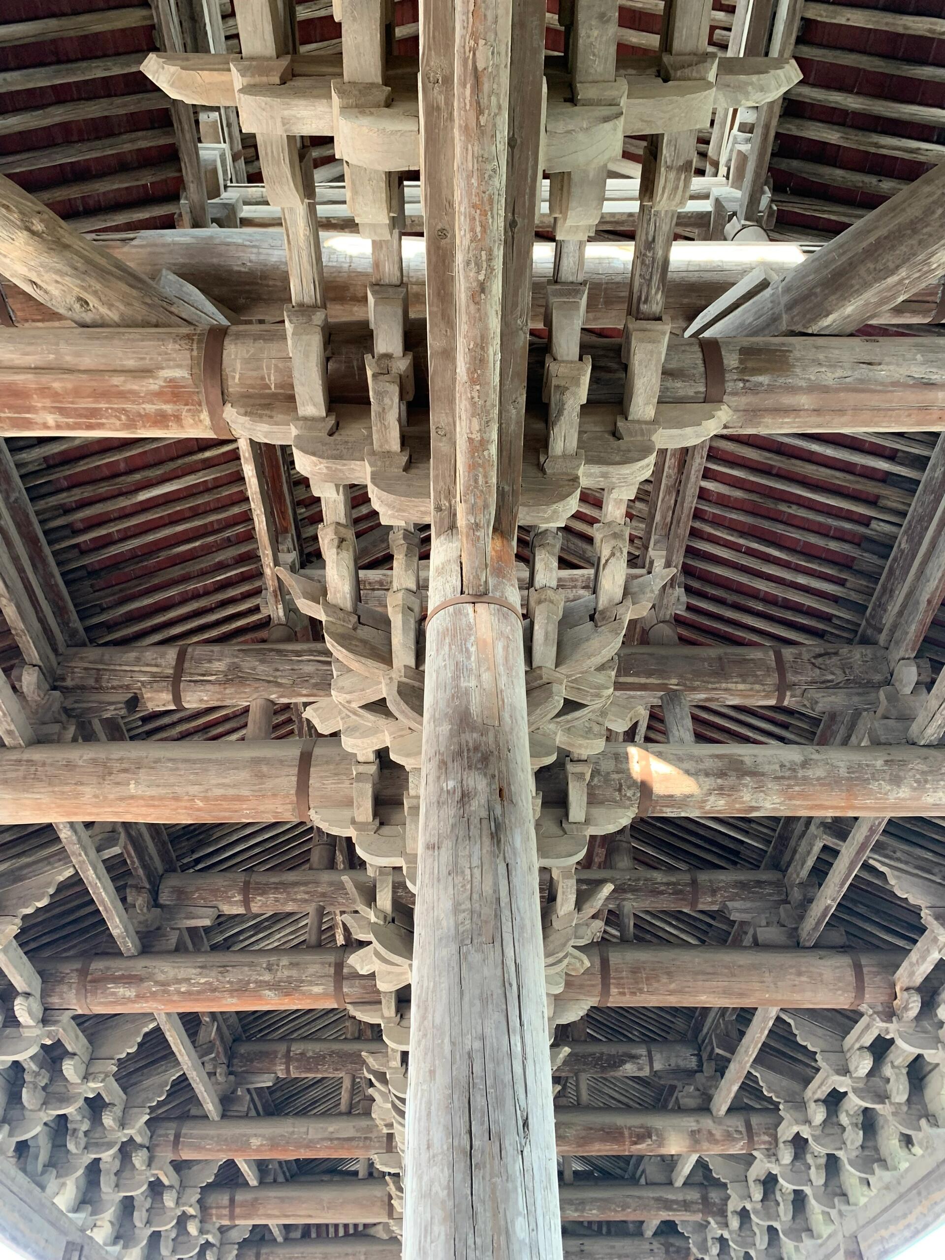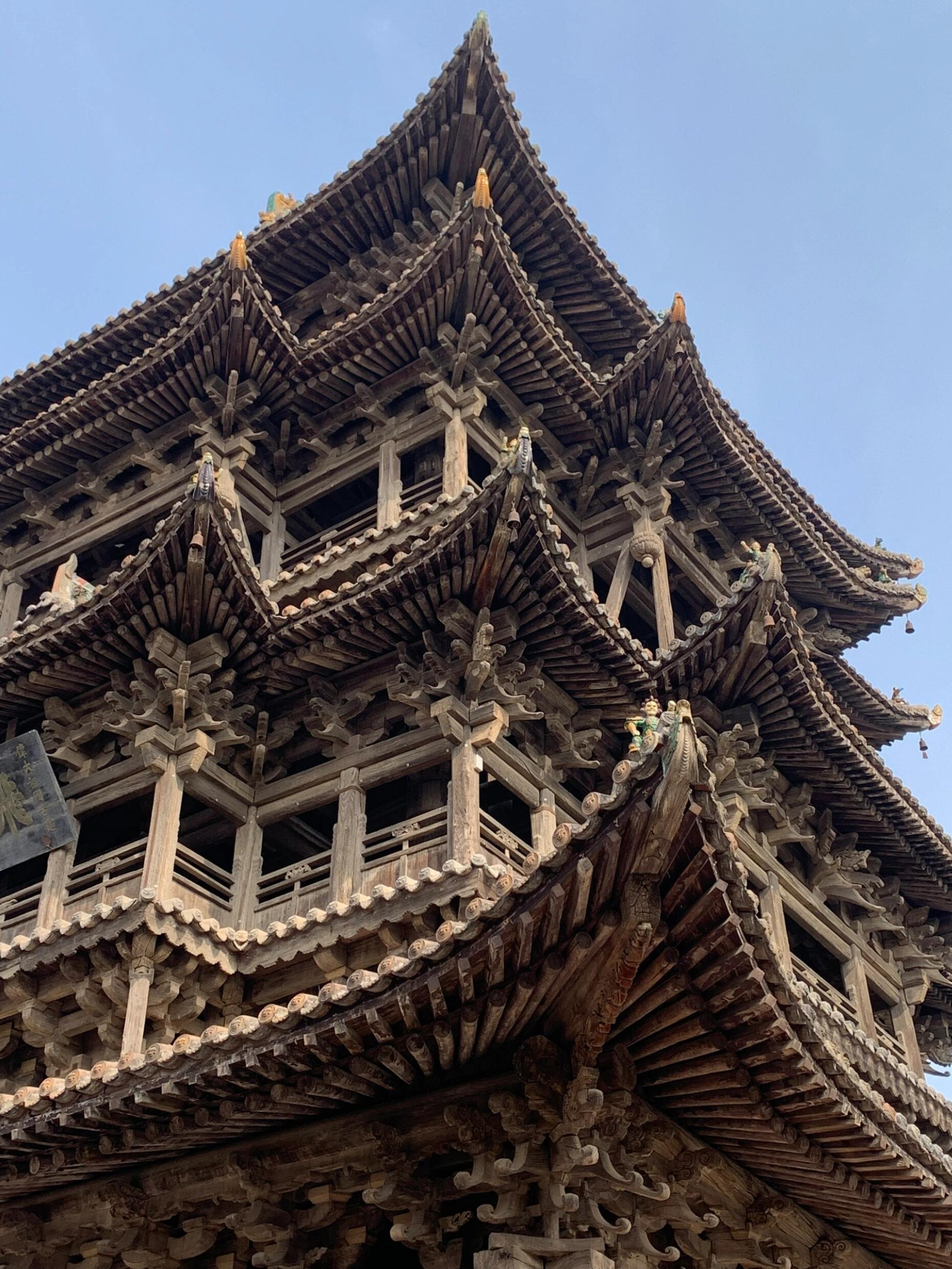 最绝的是飞云楼的檐下斗拱,密密麻麻,数量众多。耍头、昂的形状各异,有的纤细,有的粗犷,它们相互搭配,层层叠叠,像是无数精巧的零件组合成的艺术品。当阳光洒下,这些斗拱的阴影在墙面、梁柱上交错,光影变幻间,与翘起如飞的翼角相得益彰,仿佛整座楼随时都能乘风而起,飞向云端。站在楼下仰头观看,那密密麻麻的斗拱和灵动的翼角,带来的视觉冲击,让人不禁对古代工匠的精湛技艺心生敬佩。