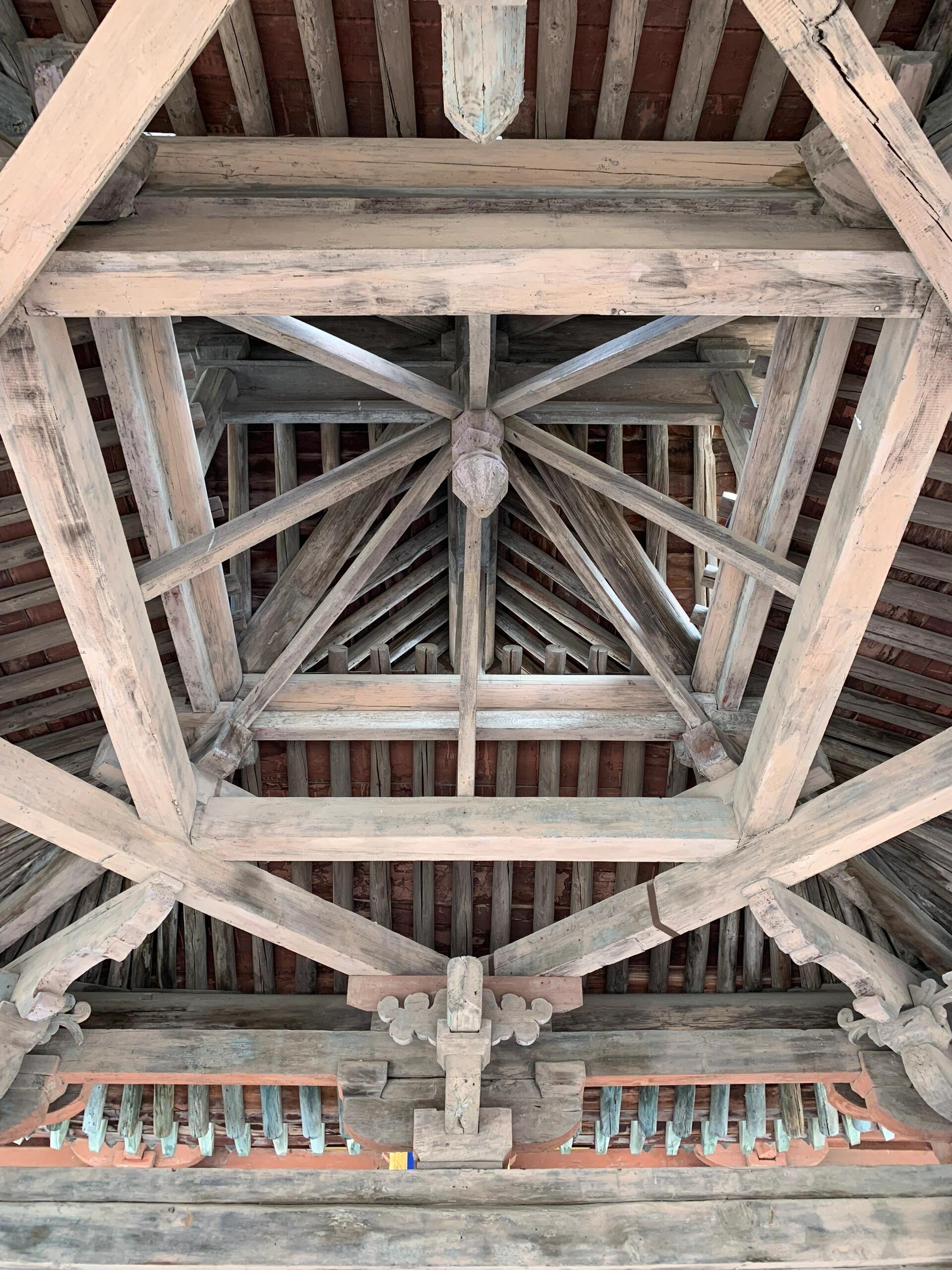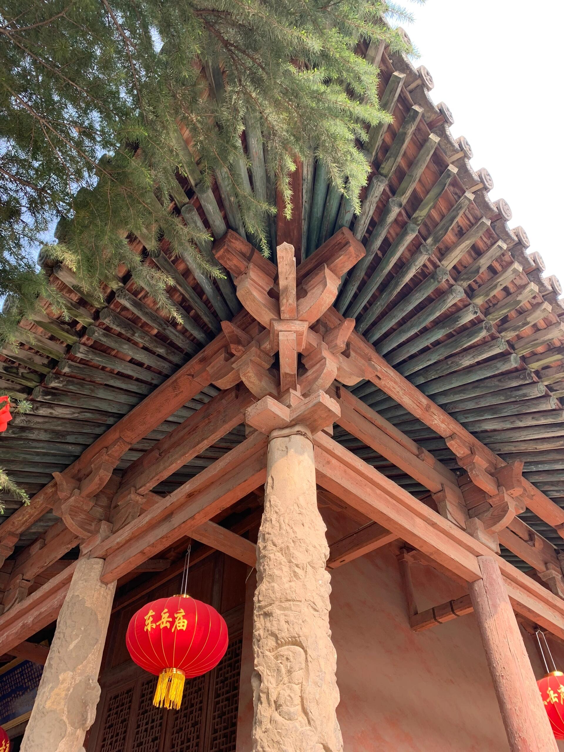 东岳庙内最引人注目的当属飞云楼。它建于清乾隆年间,身姿挺拔,三层四滴水的结构,十字歇山式的楼顶,远远望去,气势恢宏又不失灵动。楼体的二三层设有勾栏,每一面还各出抱厦,丰富了建筑的层次感。走进楼内,会发现内槽四角立着通天金柱,这四根金柱撑起了整座楼的“脊梁”,而四柱之间分层设置的多层枋材紧密相连,如同坚实的“骨骼”,构成了庞大的正方形筒式框架,让飞云楼历经岁月仍屹立不倒。