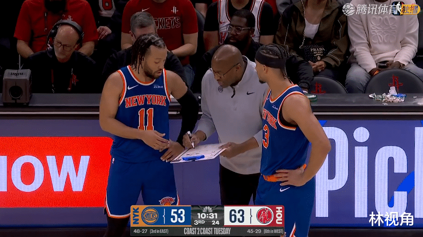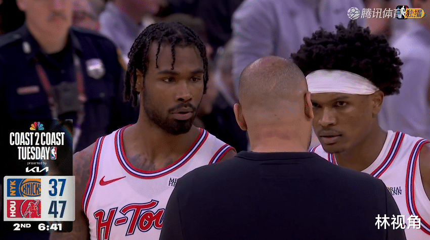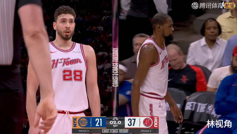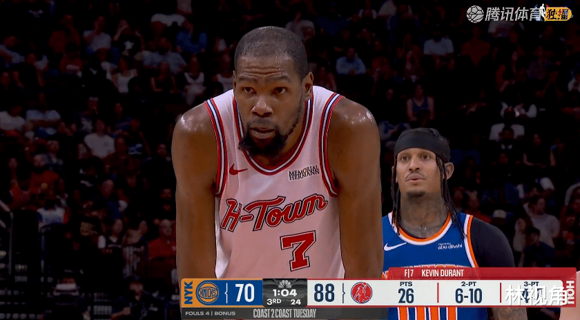 第二节,杜兰特场边休息,火箭接连外线打铁,尼克斯打出一波7-0的小高潮,将分差缩小到个位数,打停了火箭。