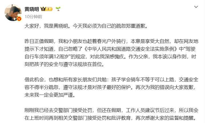 4月5日,演员黄晓明在社交平台公开发文,就自己此前的交通违法行为向公众道歉。