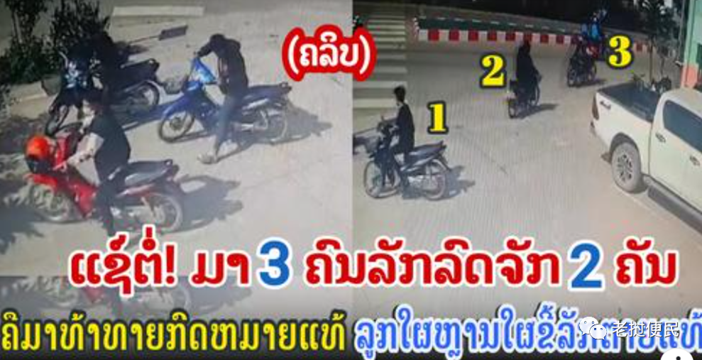 只见三个老挝小蟊贼鬼鬼祟祟的左顾右盼的,没一会就走向路边停着的摩托车,其中一人放风。