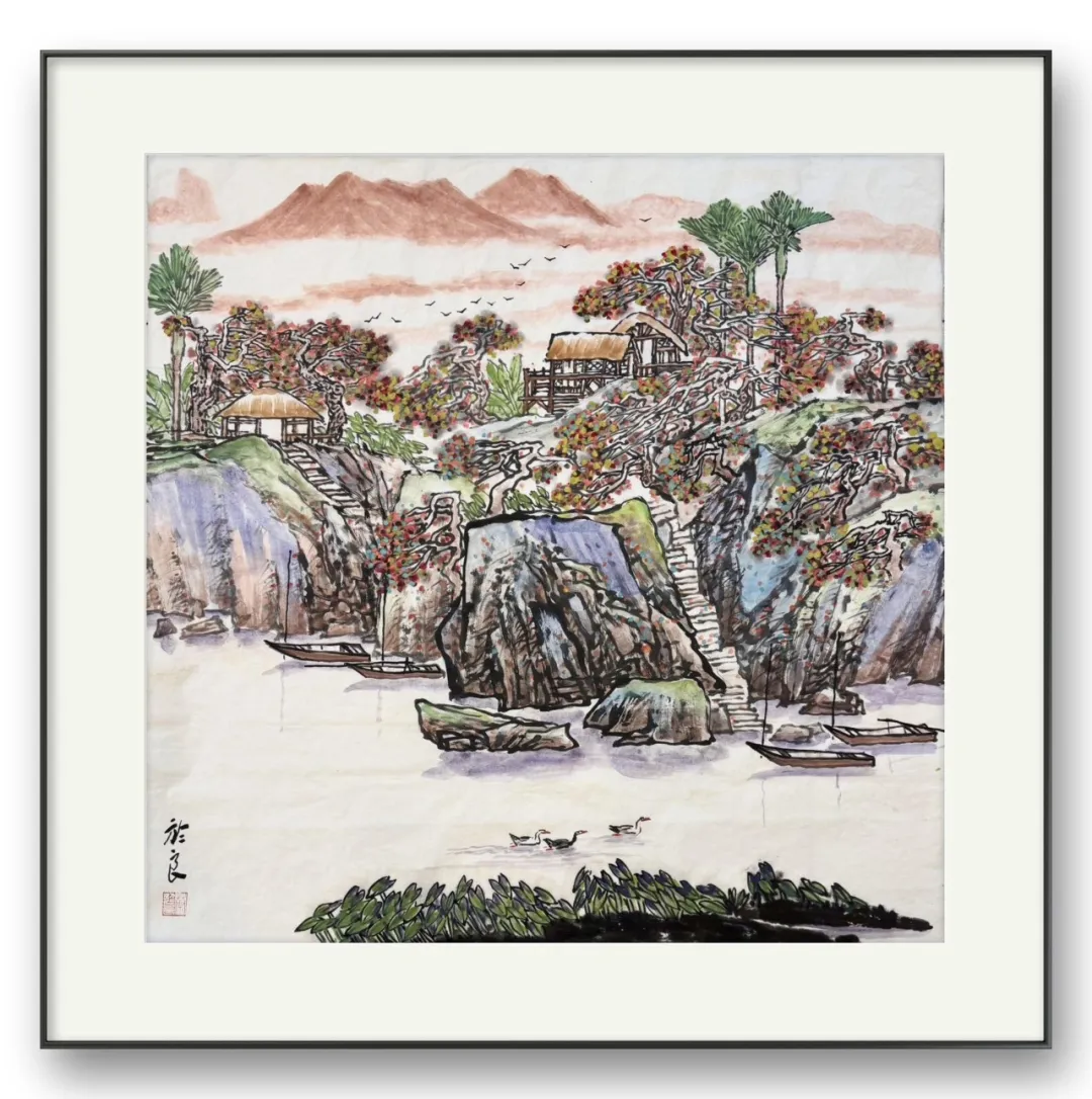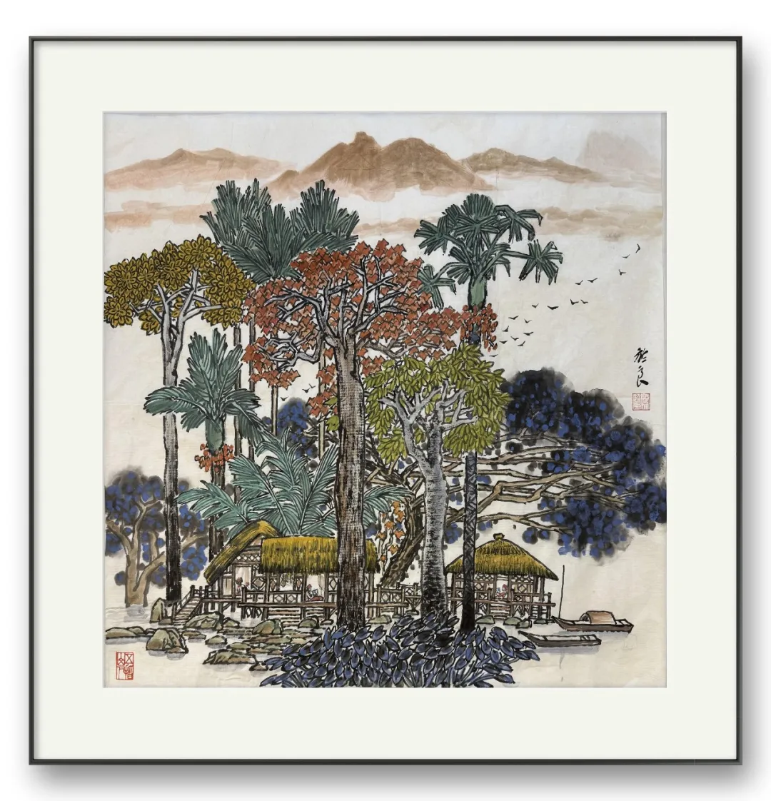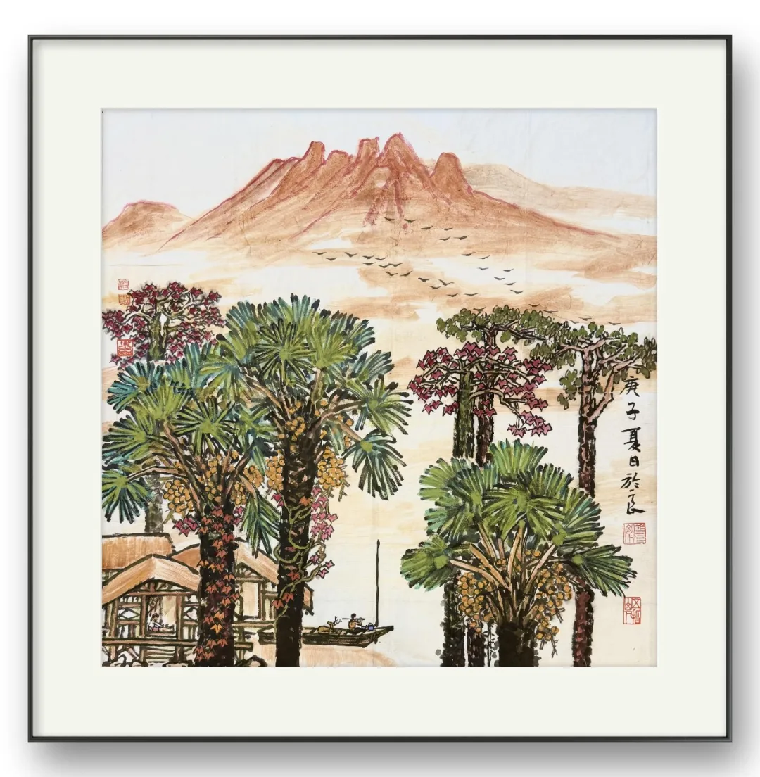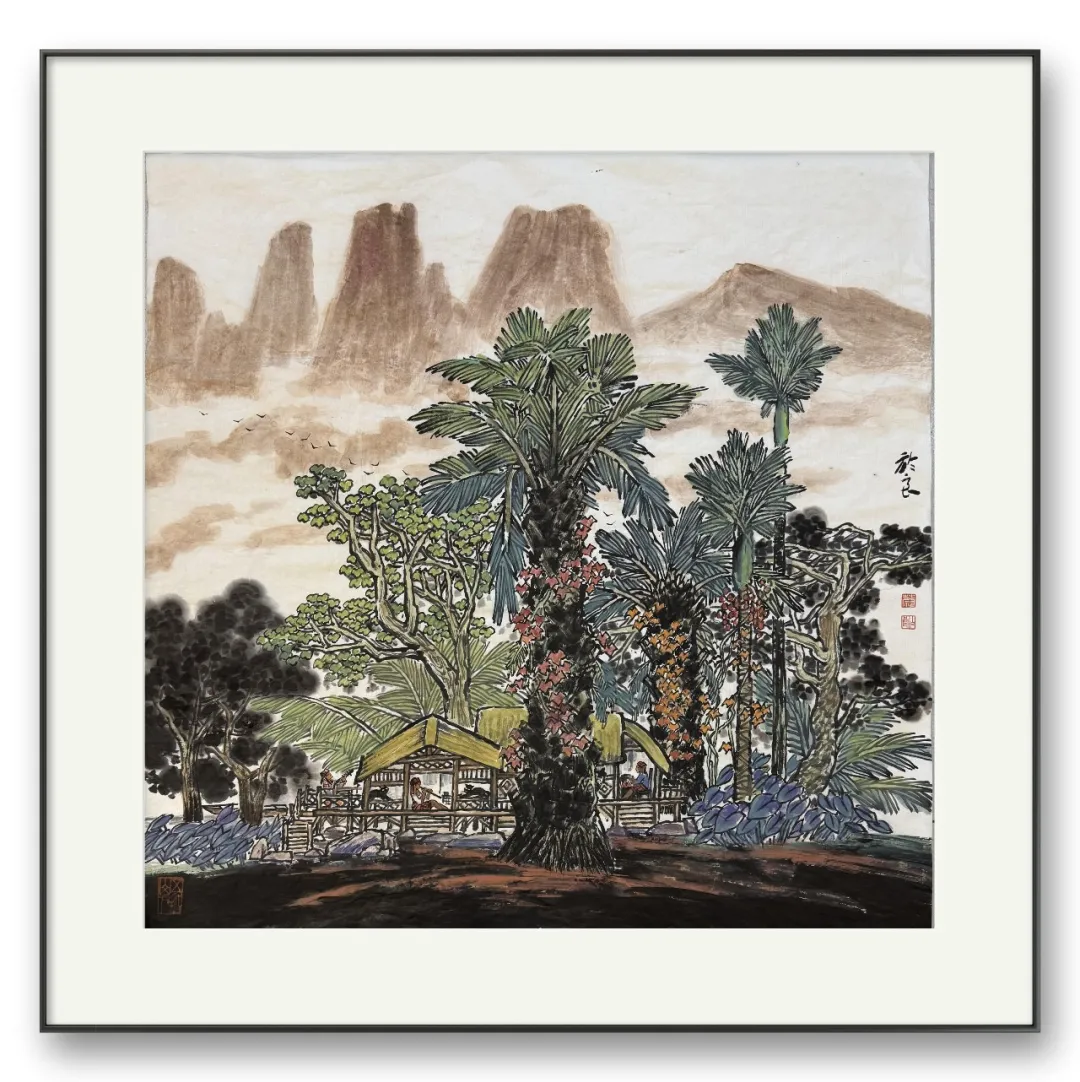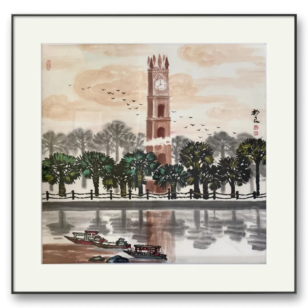 蔡於良的国画创作,以笔墨为桥梁,融南国风情与山水雅韵于一体。笔下时而钟楼依水,椰风摇情,轻舟曳影;时而翠岭连绵,云烟缭绕,村居隐现林壑之中。他将岭南之秀、山水之灵,收束于方寸尺幅,墨色浓淡相衬,线条苍润并济,营造出一片片诗意流转的意境天地。观者不仅可见自然之美好,亦能在其间寻得心灵的栖居与安宁。——「艺周刊」艺评组