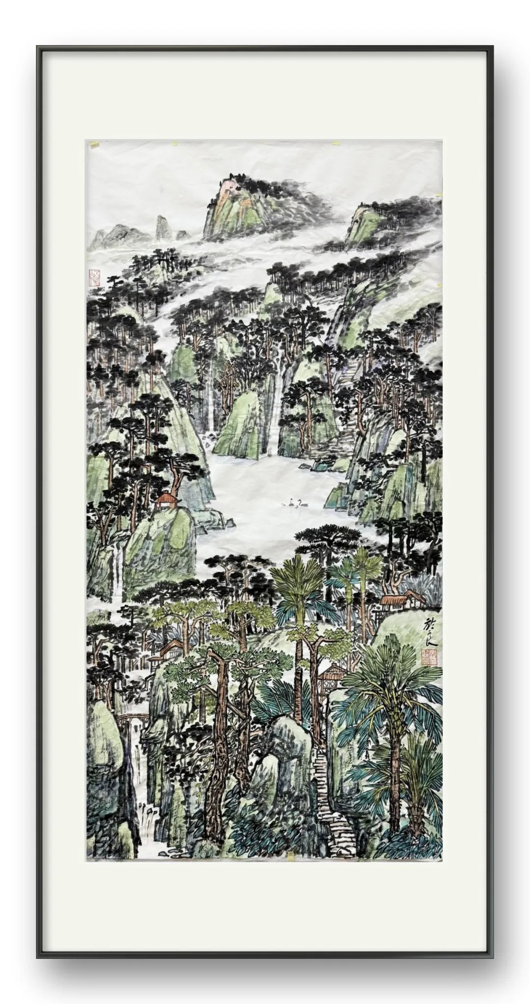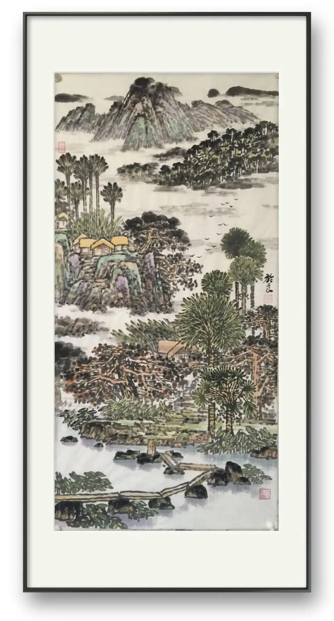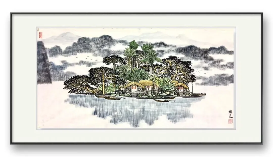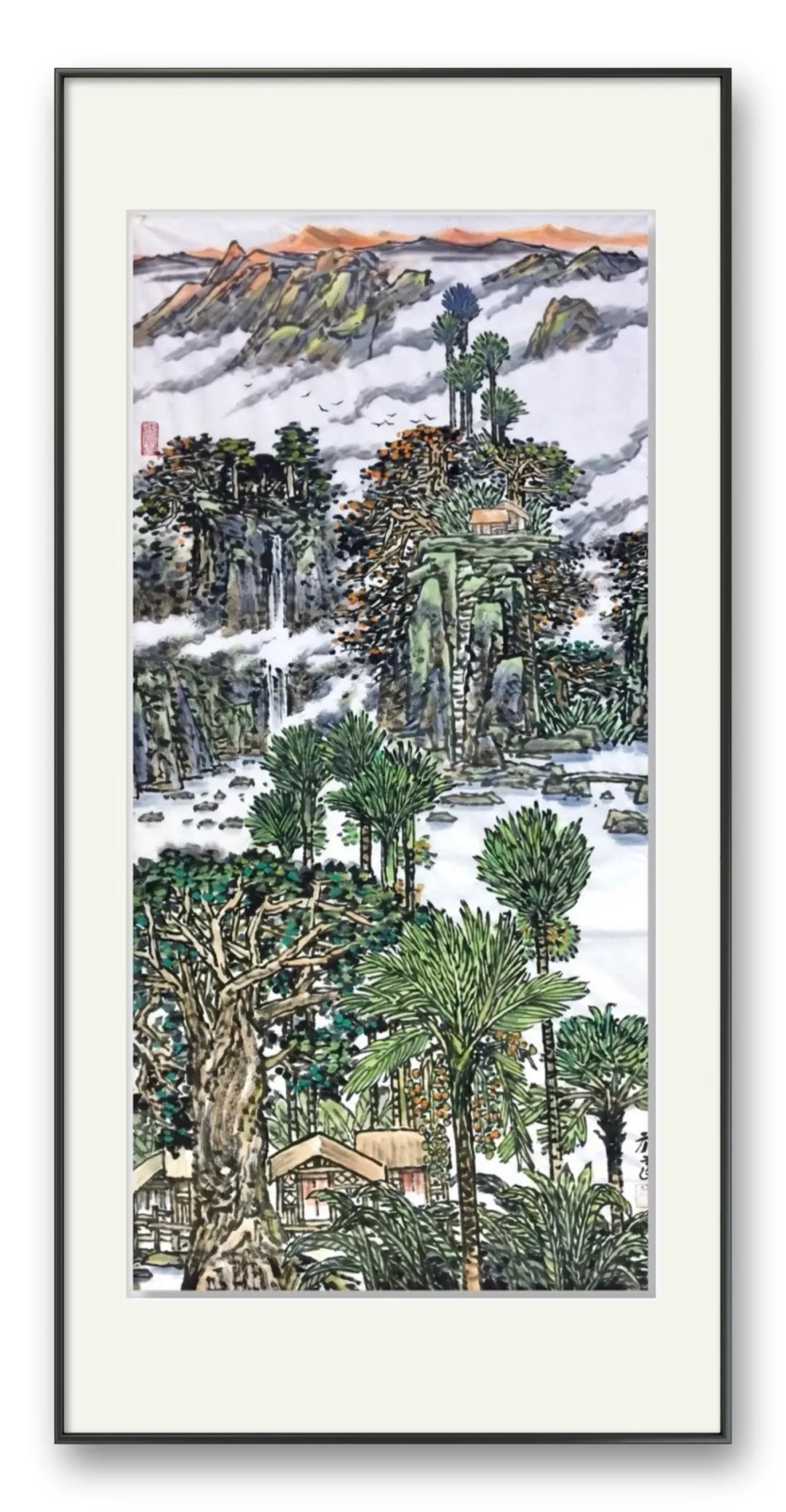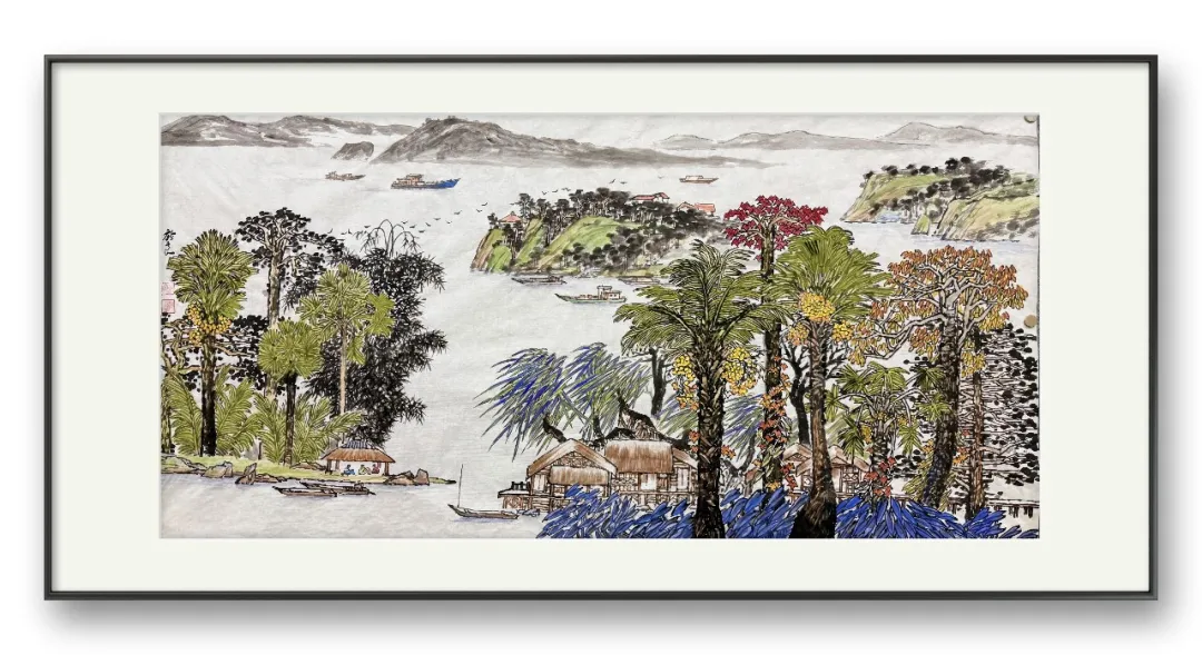 蔡於良的国画创作,以笔墨为桥梁,融南国风情与山水雅韵于一体。笔下时而钟楼依水,椰风摇情,轻舟曳影;时而翠岭连绵,云烟缭绕,村居隐现林壑之中。他将岭南之秀、山水之灵,收束于方寸尺幅,墨色浓淡相衬,线条苍润并济,营造出一片片诗意流转的意境天地。观者不仅可见自然之美好,亦能在其间寻得心灵的栖居与安宁。——「艺周刊」艺评组
