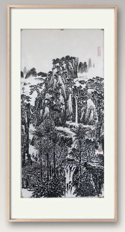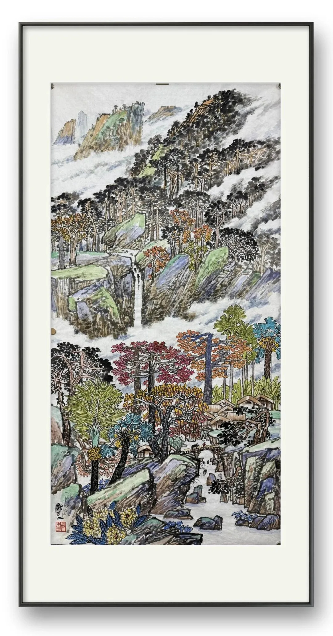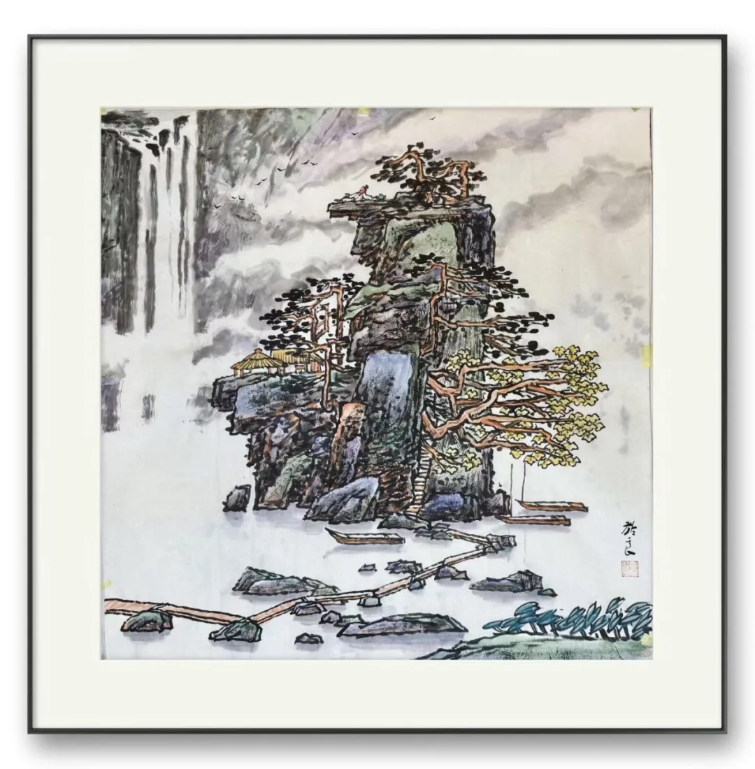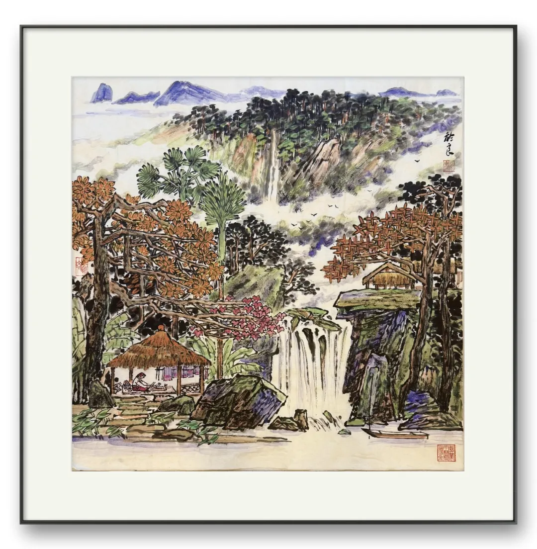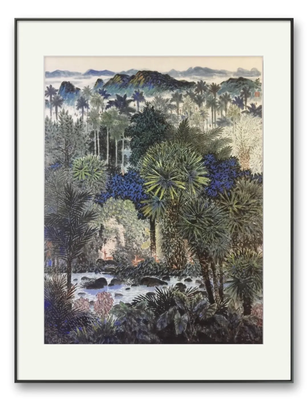 蔡於良的国画创作,以笔墨为桥梁,融南国风情与山水雅韵于一体。笔下时而钟楼依水,椰风摇情,轻舟曳影;时而翠岭连绵,云烟缭绕,村居隐现林壑之中。他将岭南之秀、山水之灵,收束于方寸尺幅,墨色浓淡相衬,线条苍润并济,营造出一片片诗意流转的意境天地。观者不仅可见自然之美好,亦能在其间寻得心灵的栖居与安宁。——「艺周刊」艺评组