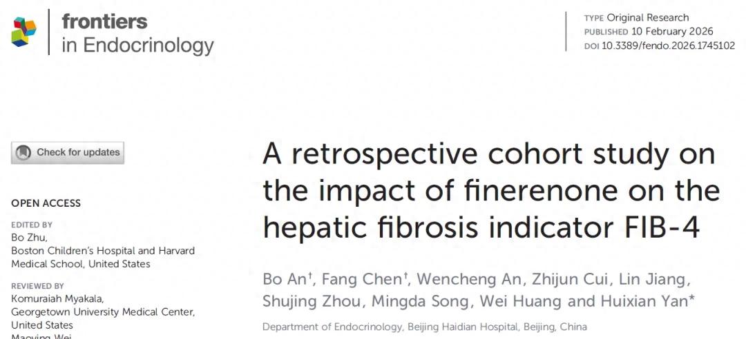 1. An B, Chen F, An W, Cui Z, Jiang L, Zhou S, Song M, Huang W and Yan H. A Retrospective Cohort Study on the Impact of Finerenone on the Hepatic Fibrosis Indicator FIB-4. Front Endocrinol. 2026; 17: 1745102. doi: 10.3389/fendo.2026.1745102