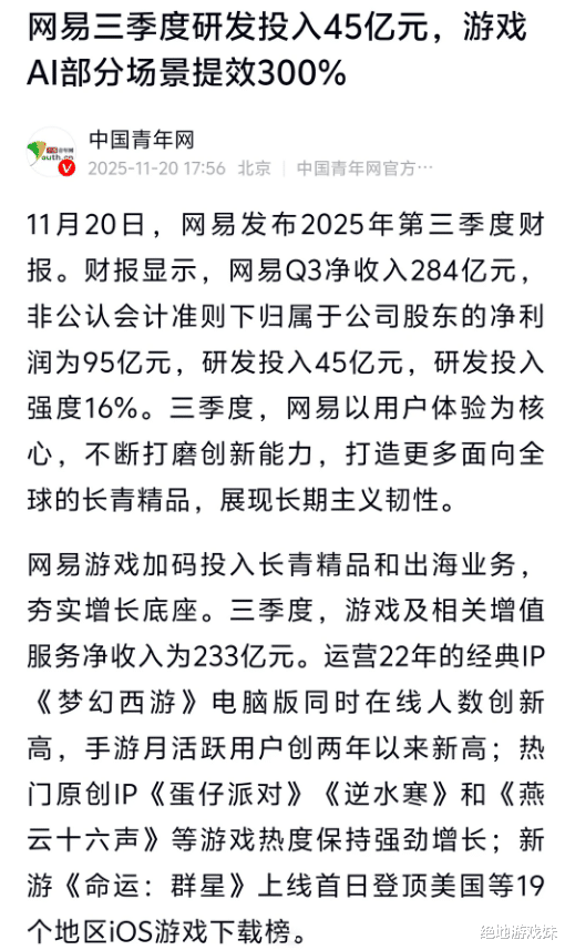 11月20日,知名互联网公司网易公开了自己2025年第三季度的财报,根据财报显示网易第三季度的净收入高达284亿人民币,同比增加了8.2%,其中最突出的收入来自游戏部分,高达233亿人民币。