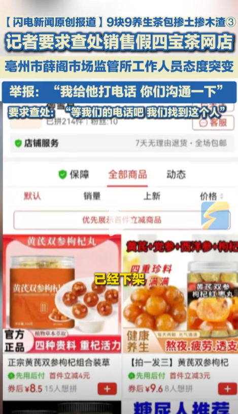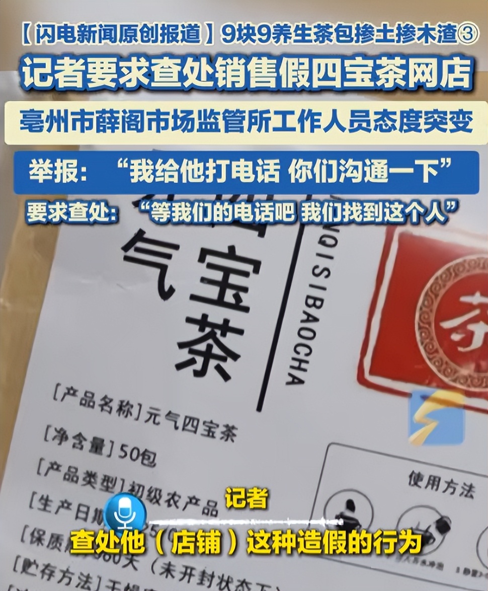 随后,闪电新闻的记者联系到了亳州当地的市场监管局,要求查处销售假四宝茶的网店,但是亳州市薛阁市场监管局工作人员的态度却有些迷惑。