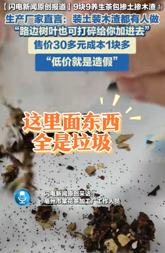 据了解,闪电新闻的记者来到了亳州市某食品生产厂,以采购养生茶为由,让老板说出了其中的内幕。生产厂家直言:“哪怕给你下土,下木渣都有人做,路边的树叶打碎给你加进去,叫我给你装土,我就给你装,亳州没有最低价,只有更低价!更低的时候给你造假,吃的核籽儿都给你破碎,破碎能压秤,完全没有作用,说白了就是他喝了一点热水有作用。某平台上宣传的什么耳鸣,30多块钱一袋,成本其实就1块多,那里面全是垃圾。”