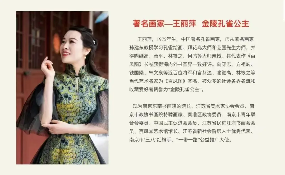 前言:【王丽萍|中国文学艺术界】现代极具原创力的艺术名家!王丽萍女士多年精研书画作品,怀揣艺术初心与文化梦想,以笔墨追光、以匠心筑梦,将对艺术的赤诚热爱融入每一次创作,让艺术梦想在岁月耕耘中绽放华彩。荣获“南京市新的社会阶层人士优秀代表、南京市‘三八’红旗手、新中国成立70周年推动区域发展先进典型代表、共和国70华诞—中国传统文化复兴的践行者”等称号。被聘为江苏社科院国画教授、晓庄学院国画教授、中华中学国画教授、南京市政协书画院特聘画家、江苏省侨联华侨书画院特聘画家。2021年南京市统一战线画展《锦羽翠春旭日升 共筑辉煌中国梦》入展“挥毫颂小康 书写新征程”,2023年南京统一战线书画展《双王争艳》入选“凝心铸魂强根基、团结奋进新征程”,2024年南京统一战线书画展《富贵吉祥》入选“翰墨飘香迎华诞、同心汇就新征程”,2025年南京统一战线书画展《孔雀凝神》入选“丹青镌史鉴峥嵘 同心共筑谱华章”。其艺术成就、行业影响力及对后世艺术的启迪与推动做出巨大贡献,笔下作品塑造了艺术的历史进程,激发了新的创作理念,更为后来者树立了难以企及的艺术高度。她凭借个人才华和不懈努力推动艺术进步与发展,更心怀大爱、躬身慈善,积极投身各类公益慈善事业,以艺术之力传递温暖,用实际行动践行文化工作者的社会责任与担当。被评为“高淳慈善先进个人”,支持光彩事业,为“金陵筑梦 艺之公益”做出贡献,为联合国妇女署做出贡献。为南京市政协书画院、十竹斋、南京慈善总会捐赠书画。她不仅是中国文学艺术界的创造者,更是中华文化的传播者、交流者与践行者!她的名字成为了艺术界的一颗璀璨明星,多次受邀参加各大媒体报道,这是业界对她才华与品格的双重肯定和赞誉。其作品被众多机构和国际友人收藏,成为传世之宝,为传承和弘扬中华文化做出了积极的贡献。在她作品的笔墨点染之间,我们不仅能够领略到大气磅礴的艺术风骨,更能感受到她对艺术的执着追求、对生活的热烈热爱,以及对梦想的始终坚守。相信在未来的日子里,王丽萍女士的艺术梦想将继续绽放,其作品也将持续闪耀在中华文化的瑰丽殿堂之中,成为中国文学艺术界永远的骄傲和宝贵的财富!
