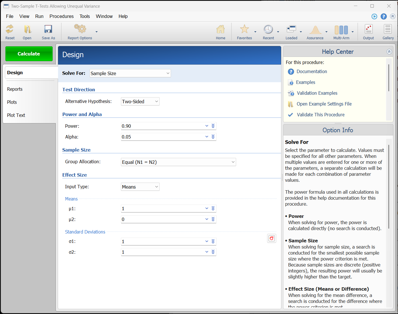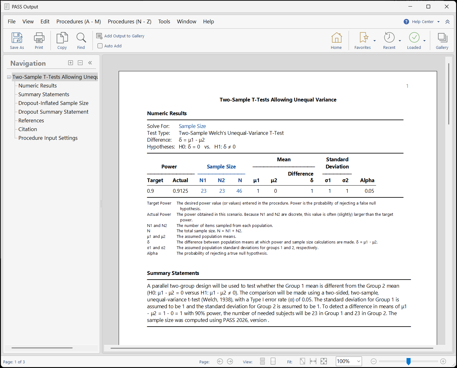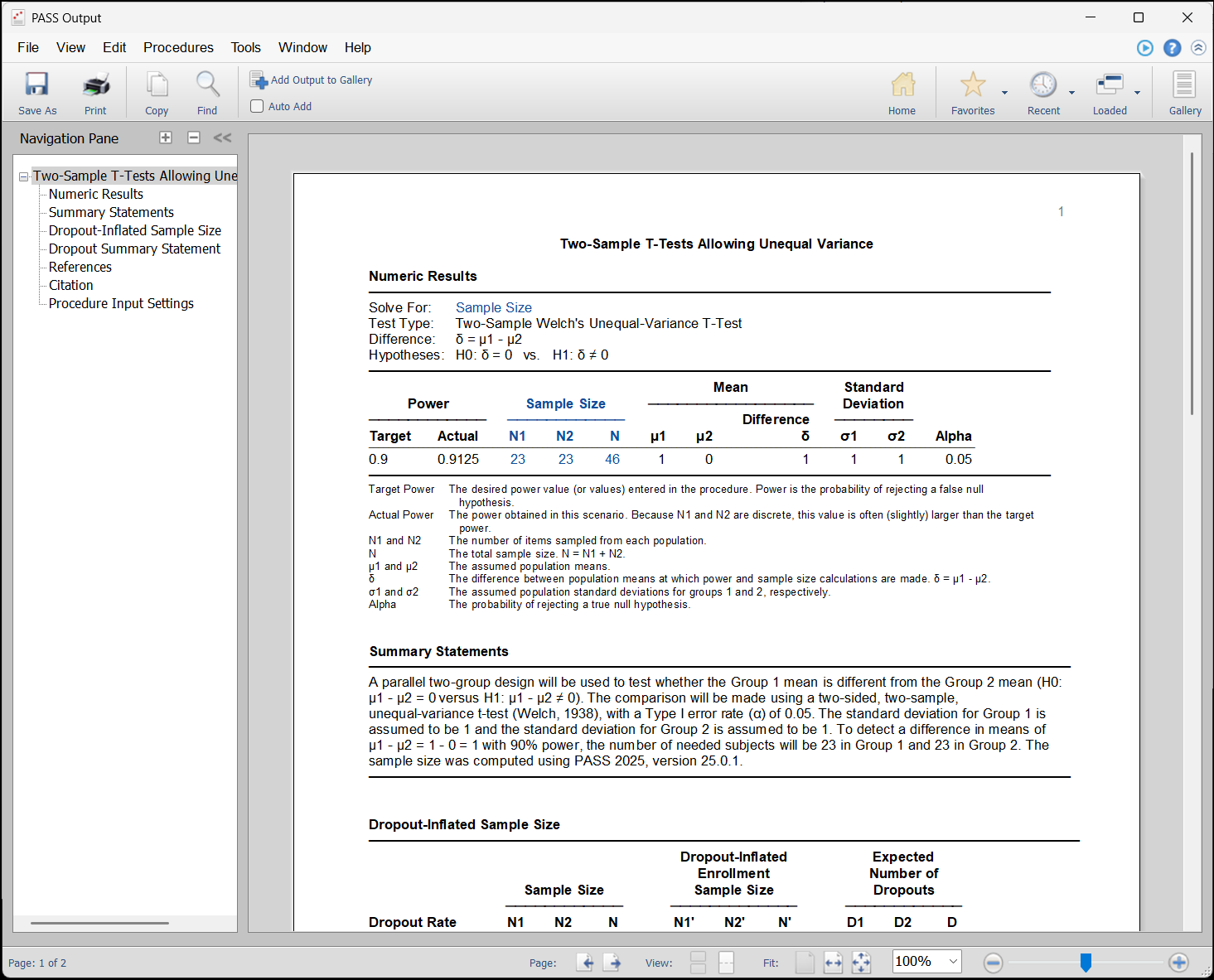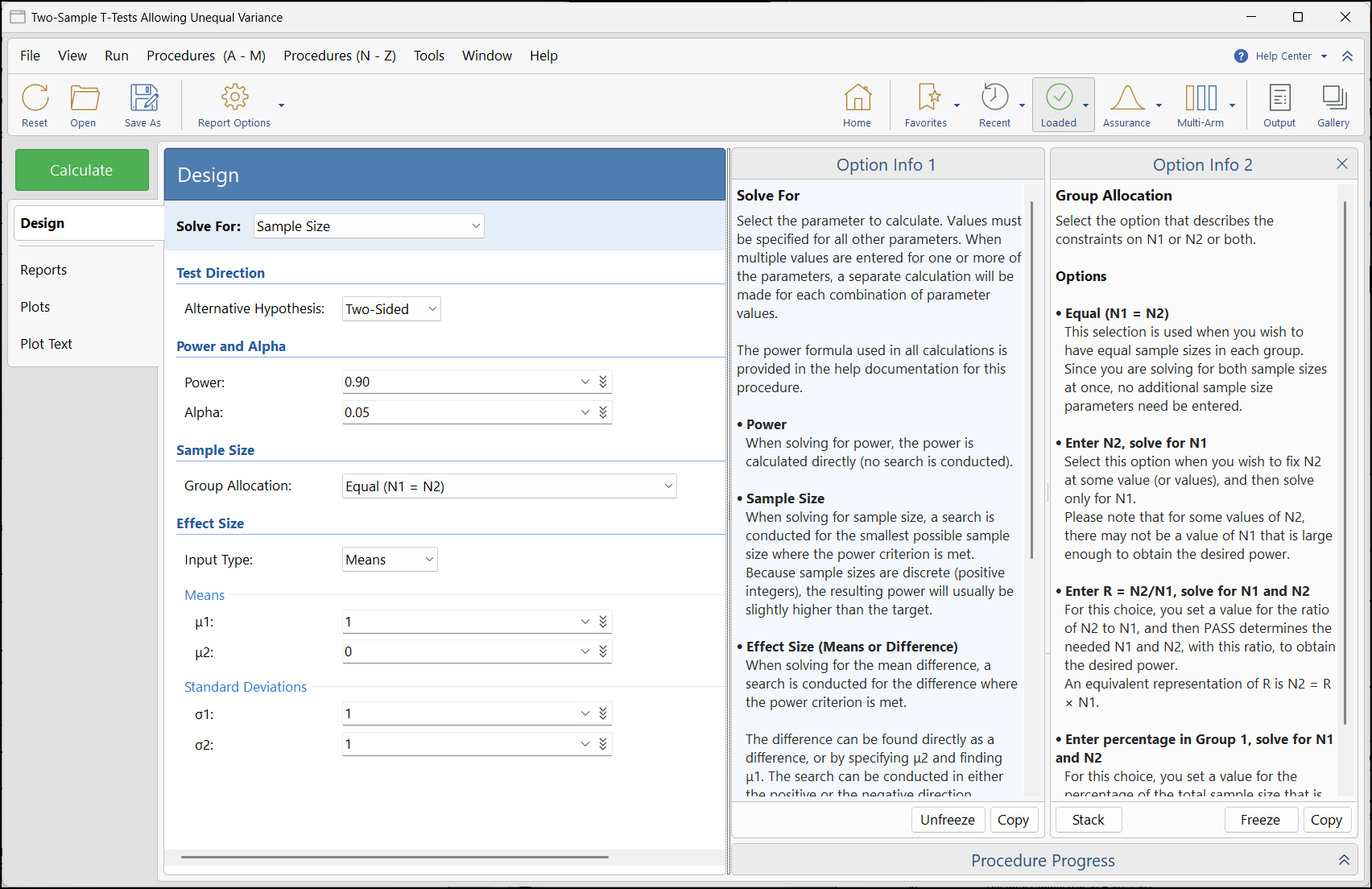 PASS旧版本程序窗口(允许方差不等的两样本t检验)