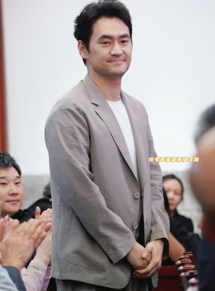 他身着贴合身形的简约服饰,线条干净利落,搭配整齐的发型,整个人显得清爽精神,既有成熟男演员的魅力,又不失文艺气质。