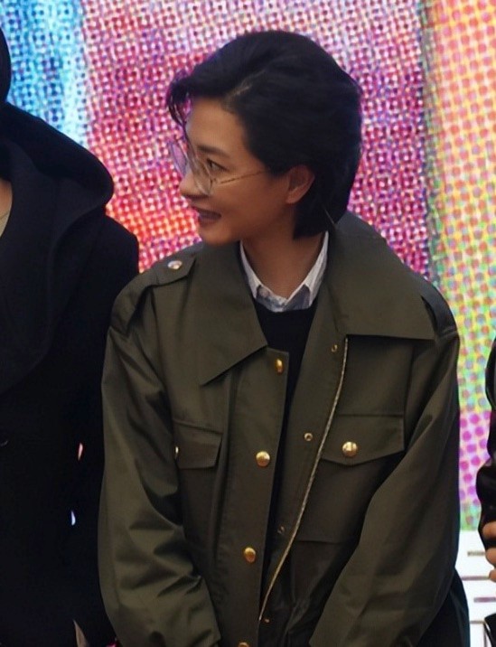 她留着利落短发,佩戴简约眼镜,身穿军绿色夹克叠搭内搭,造型干练帅气,文艺正气兼具,瞬间让人梦回她在经典作品中的干练形象。