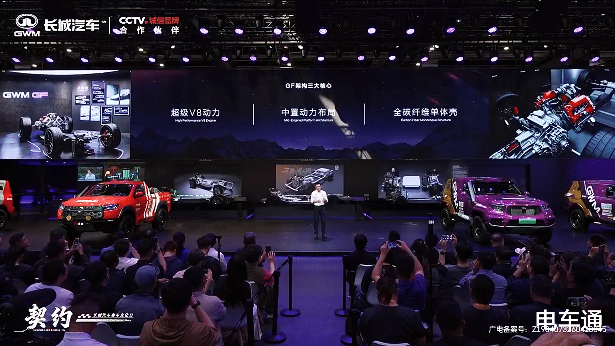 在本次活动中,动力机械及工程博士、长城超豪车BG CEO宋东先发布了长城汽车自主研发的GF架构,该架构拥有超级V8动力、中置动力布局、全碳纤维单体壳三大核心组件。