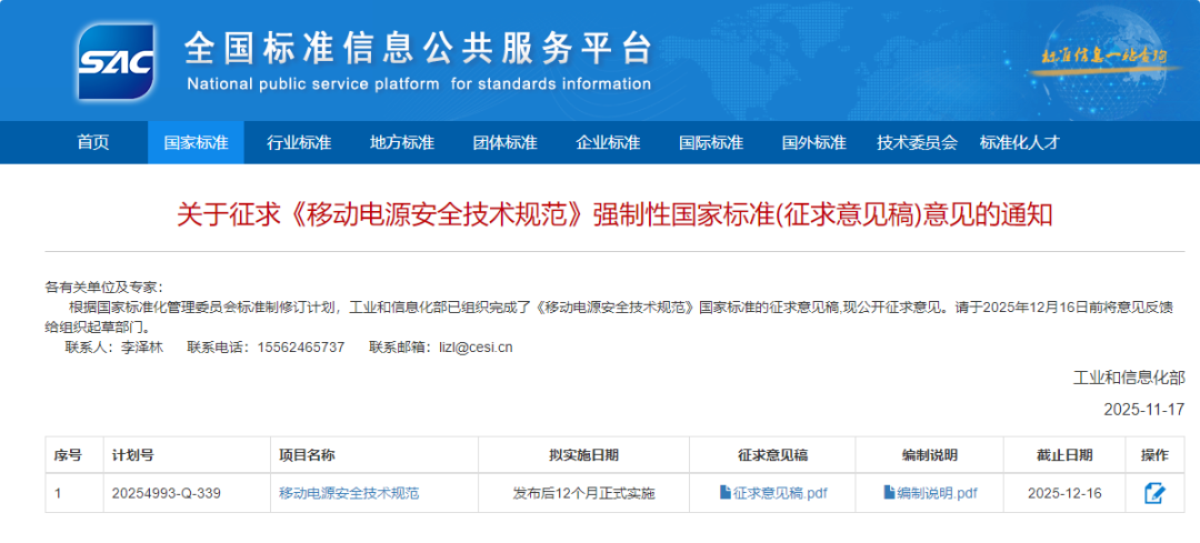 据央视财经报道,工业和信息化部最近发布的《移动电源安全技术规范》征求意见稿,针对移动电源的多项规格进行了标准化说明,被业界称为“史上最严”的充电宝新标准。目前,新标准正处于征求意见阶段,意见收集截止日期为2025年12月16日,正式版预计于 2026 年一季度发布。