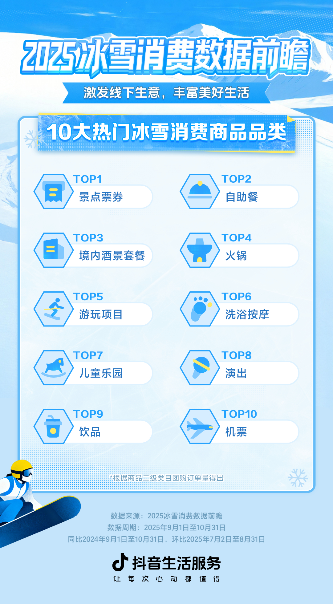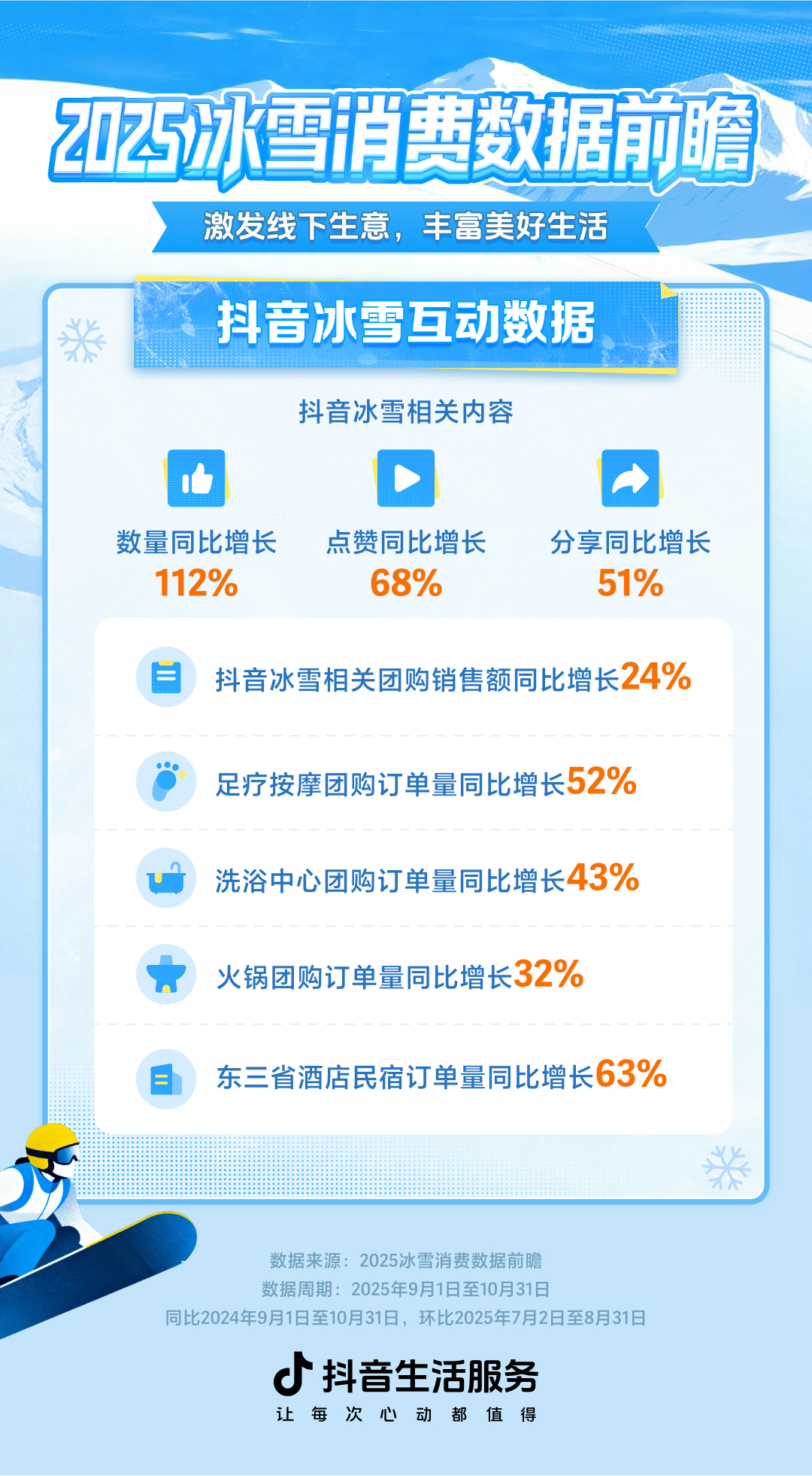 11月7日立冬当天,抖音生活服务发布“冰雪消费数据前瞻”。数据显示,9月1日至10月31日,平台“冰雪”相关内容数量同比增长112%,获赞同比增长68%,分享同比增长51%。从交易数据看,冰雪相关抖音团购销售额同比增长24%。结合冬季消费趋势,平台发起“冰雪季”系列活动,主打“跟着抖音去追雪”,联合游玩、住宿、旅行社等上万个重点冰雪商家,通过商家激励、城市线下大事件、明星达人探店与种草和城市特色追雪攻略等多项举措,激发冰雪经济。