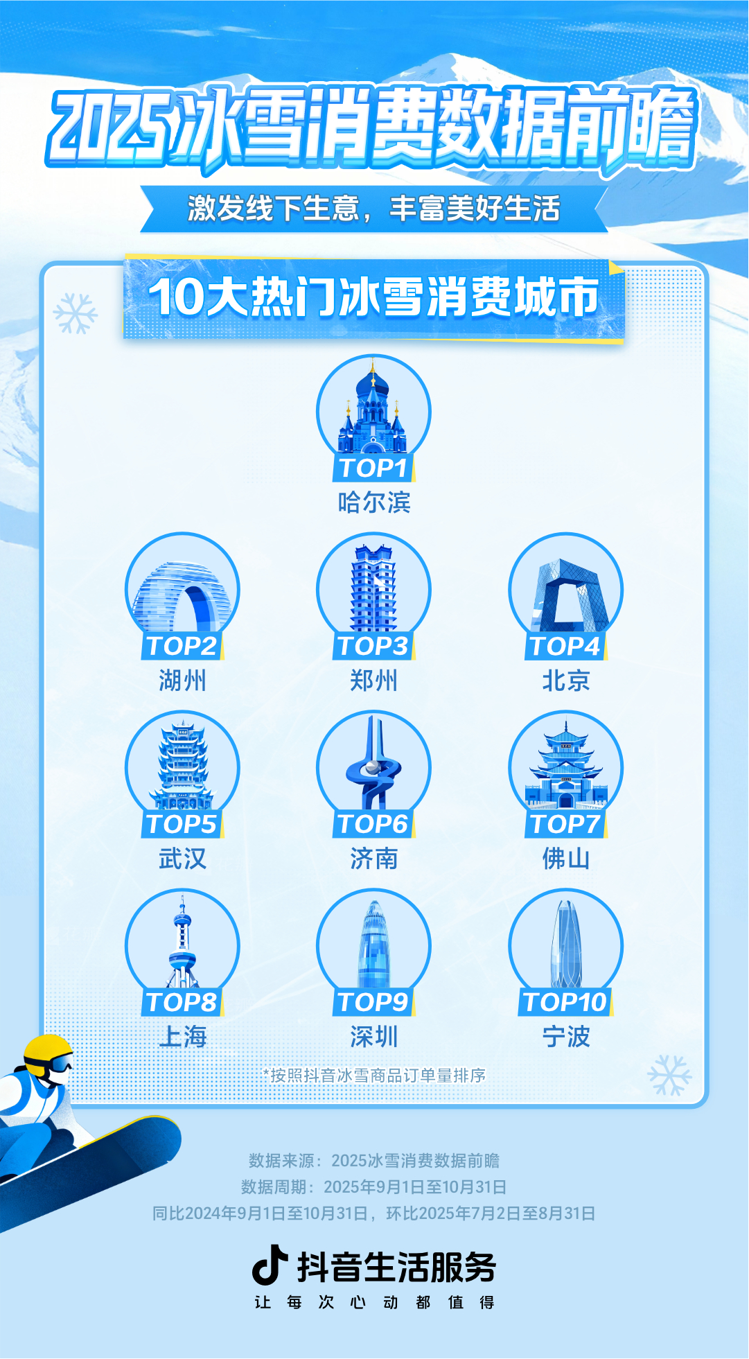 今年的“冰雪季”来得更早,从9月开始,抖音热门冰雪话题就已吸引众多用户关注。例如,#2025年的第一场雪你看了吗、#冰天雪地也是金山银山、#哈尔滨下雪了、#下雪后的黑龙江、#冬天适合去哪里旅游等,均有千万到数亿不等的曝光。从冰雪相关团购订单量维度看,哈尔滨、湖州、郑州、北京、武汉、济南、佛山、上海、深圳、宁波入围“热门冰雪消费TOP10城市”。