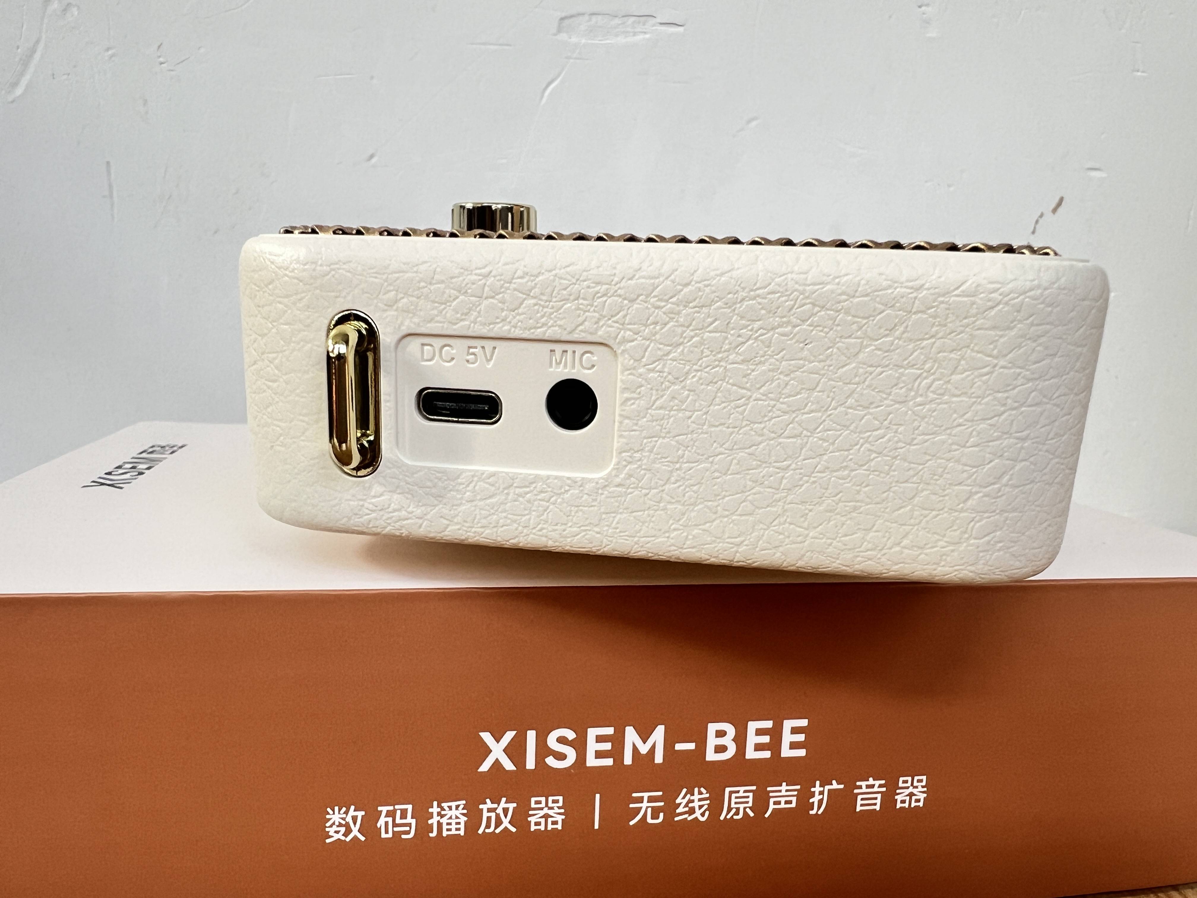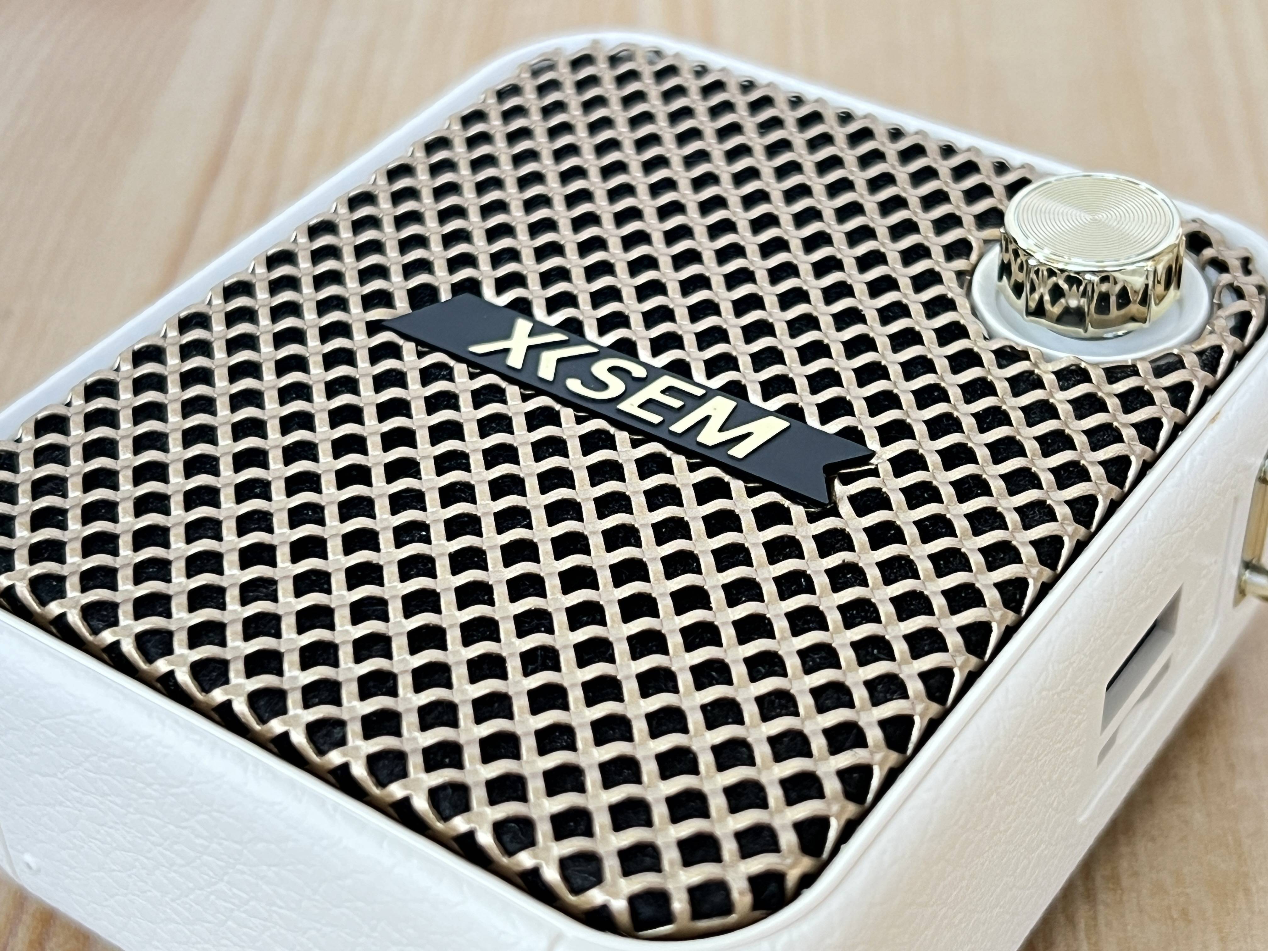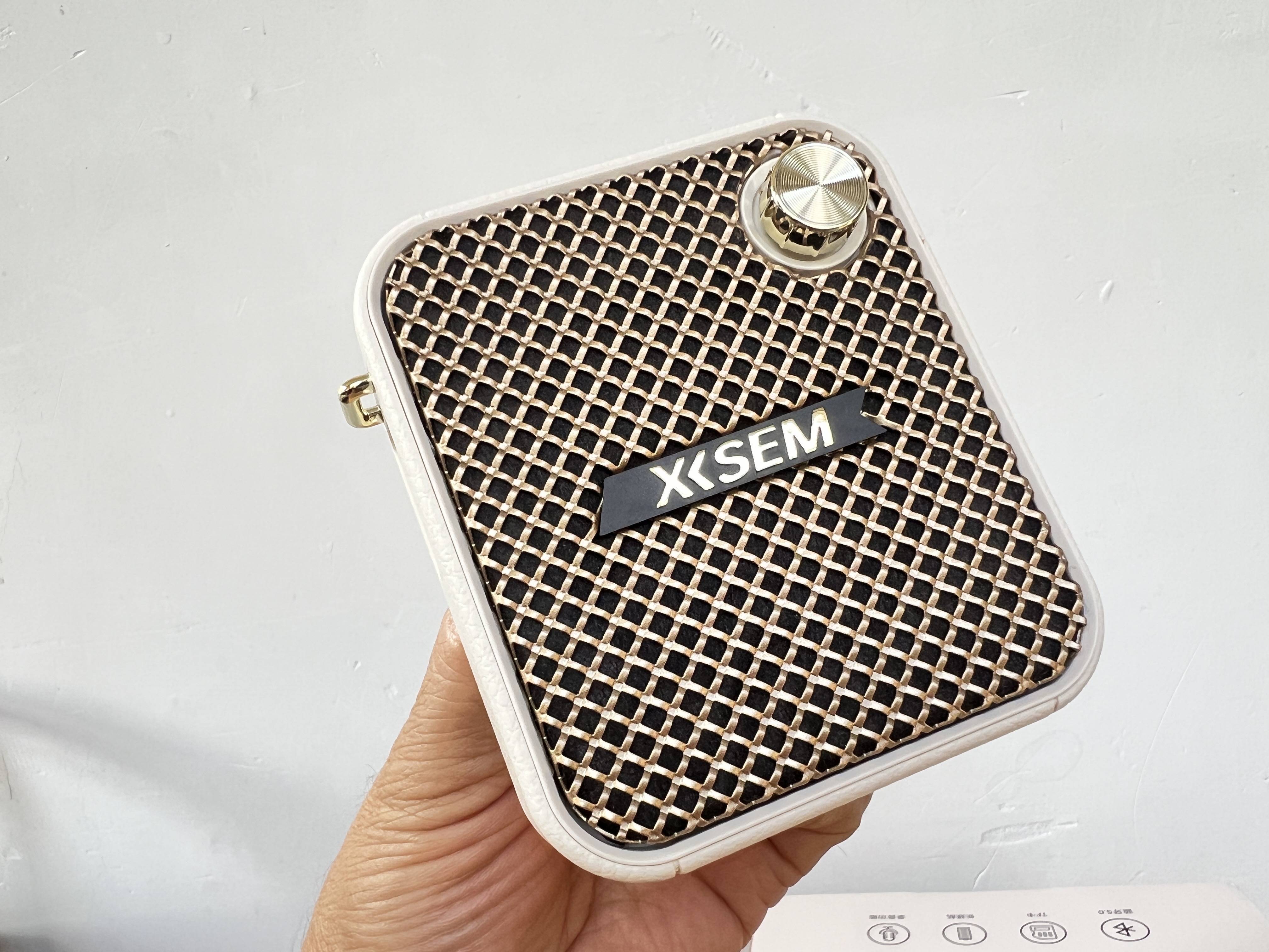 这是西圣 Bee 小蜜蜂扩音器的外观。主体颜色采用了卡其色,形状为正方形,四周包裹着精致的ABS,采用晒纹工艺,表面可以看到细腻的皮革纹,触摸手感舒适,给人的感觉是高端大气。扩音器具体尺寸约为82*37*95mm,重量约165克,精致小巧的身材和超轻的重量,使用者可以摆脱负重的累赘。正面栅格式设计可更好出声,中间位置有金色的西圣品牌LOGO。