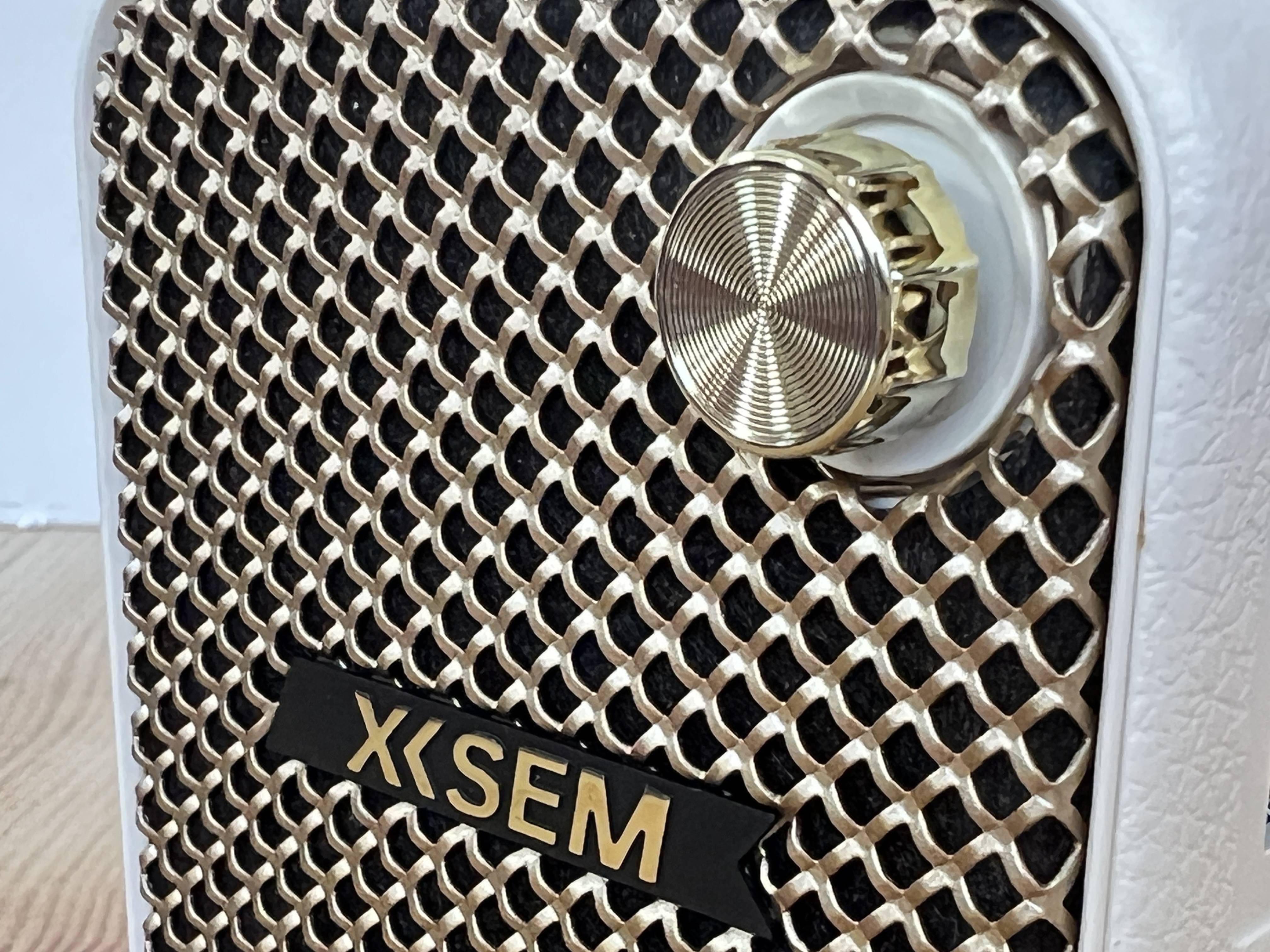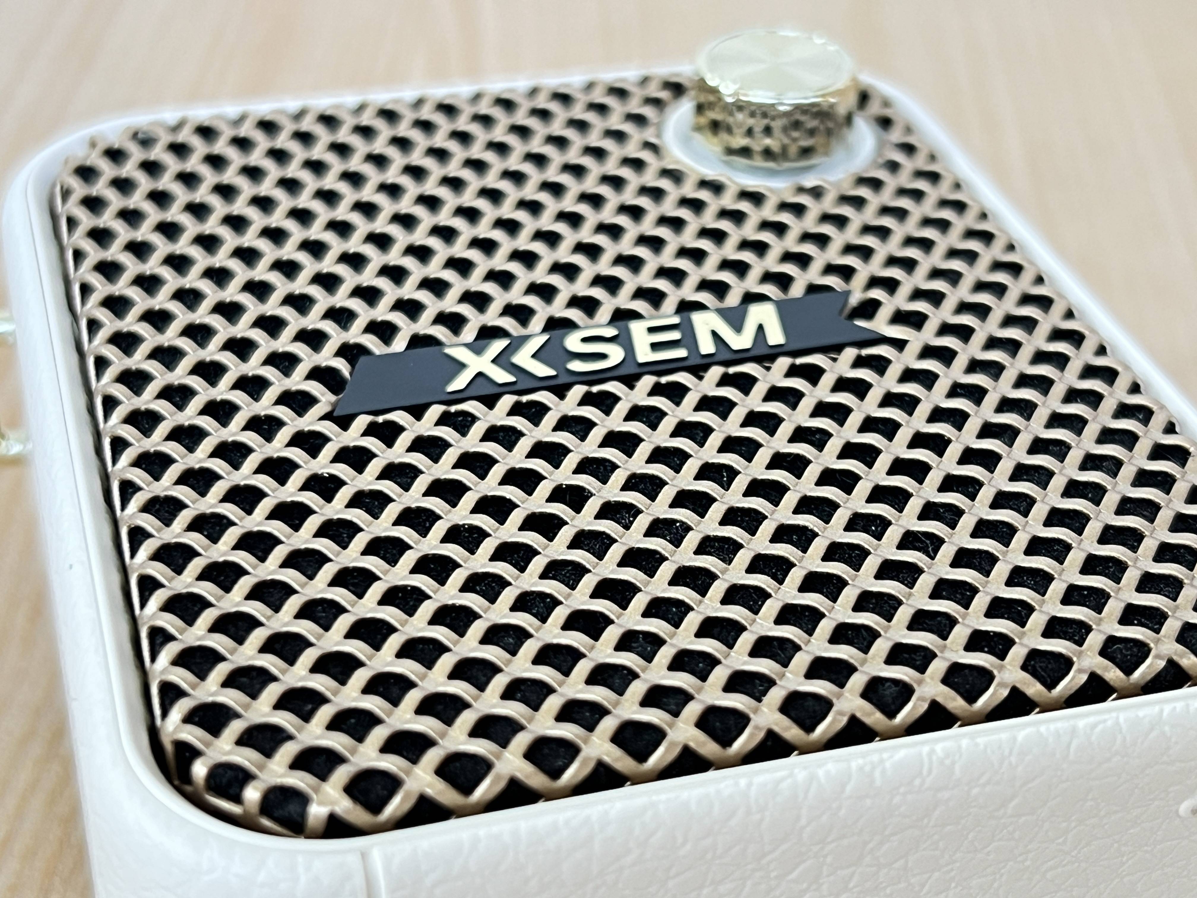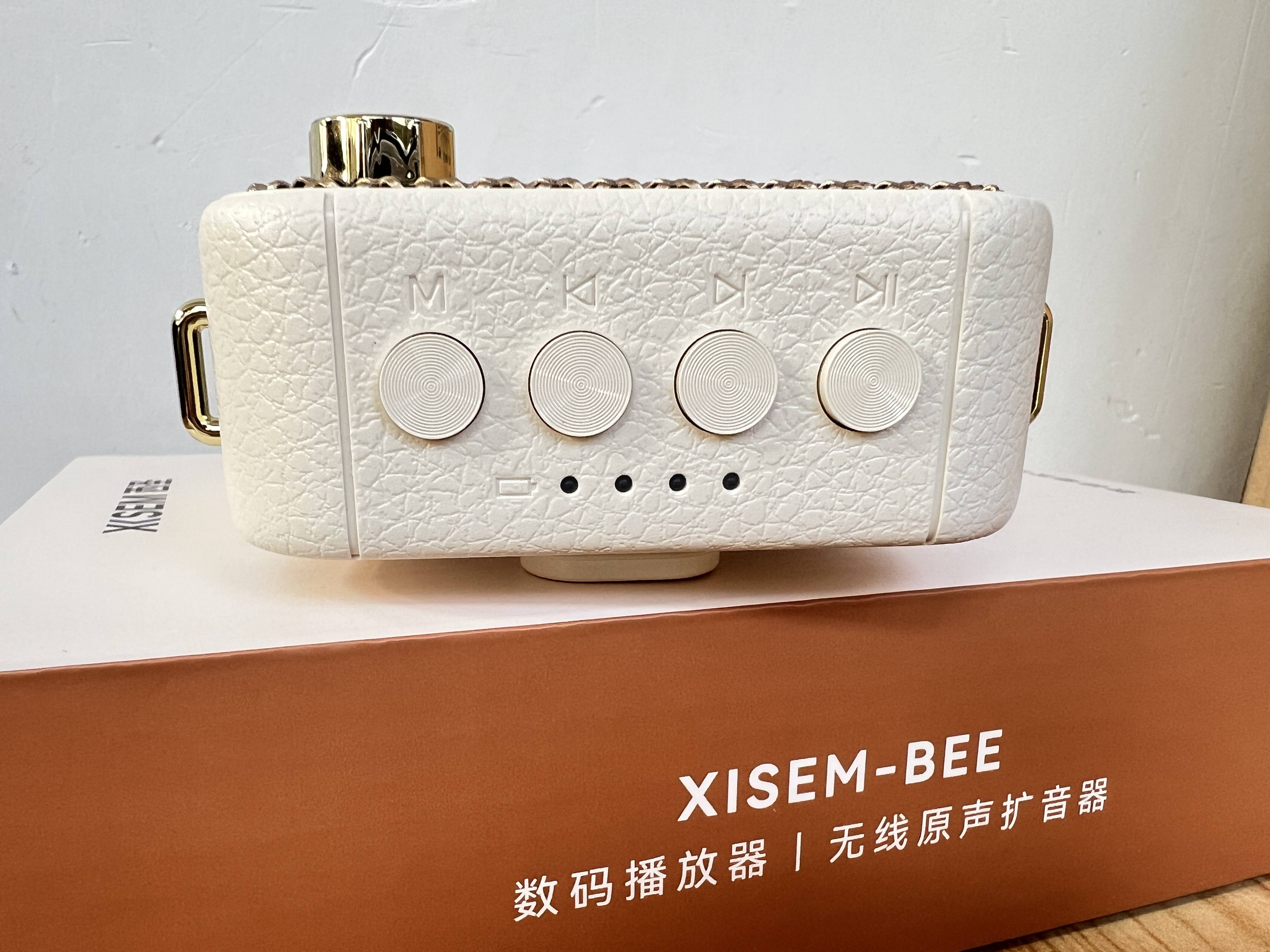 这是西圣 Bee 小蜜蜂扩音器的外观。主体颜色采用了卡其色,形状为正方形,四周包裹着精致的ABS,采用晒纹工艺,表面可以看到细腻的皮革纹,触摸手感舒适,给人的感觉是高端大气。扩音器具体尺寸约为82*37*95mm,重量约165克,精致小巧的身材和超轻的重量,使用者可以摆脱负重的累赘。正面栅格式设计可更好出声,中间位置有金色的西圣品牌LOGO。
