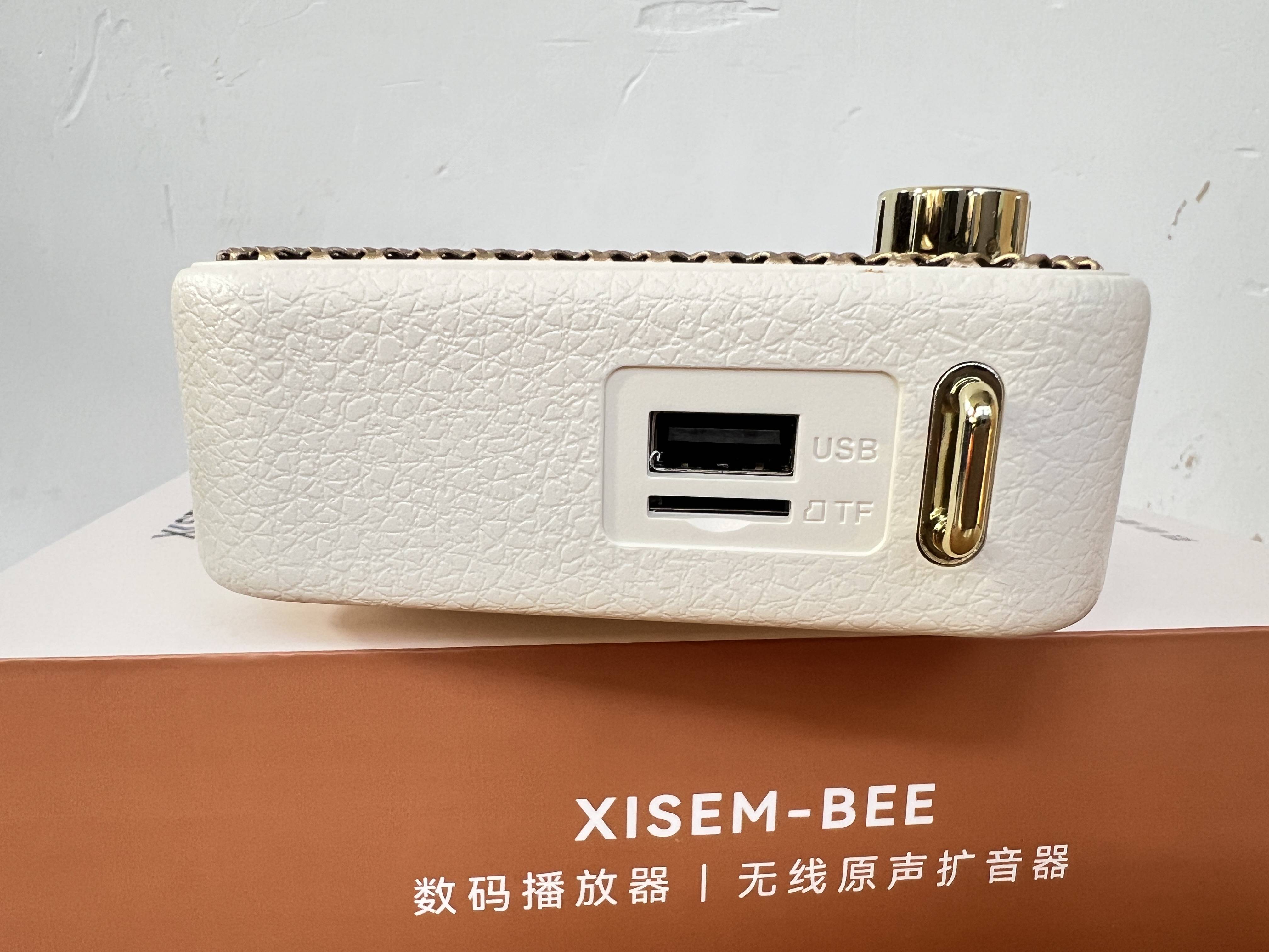 机身正面右上角的金色圆形旋钮为开关机键;机身正面右侧为TF卡和U盘接口,支持TF卡和U盘,实现即插即播。这样,除了扩音外,还能借助使用TF卡或U盘达到播放课件、伴奏音乐等功能,无需手机、无需联网,离线也可照样畅听!开关机键于音量调节和二为一,长按3秒开关机,旋动旋钮调节音量大小。