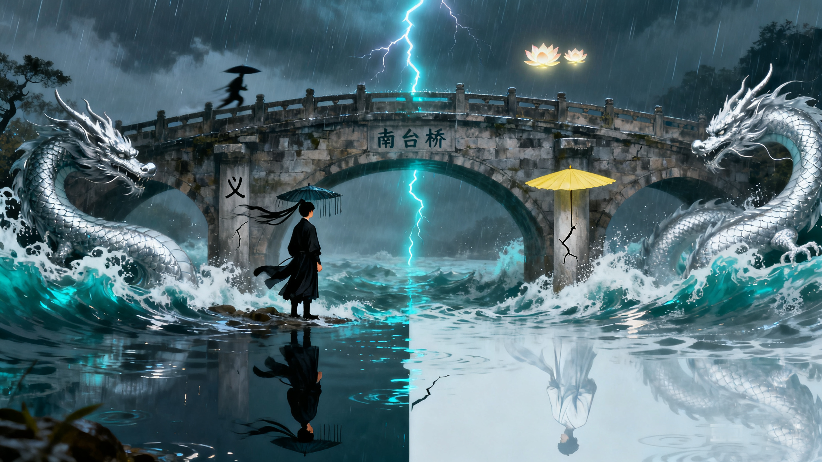 一日夏末,闷雷滚动,乌云压顶。二人听闻有户人家被歹人欺诈,他们便一同前往行侠仗义。路过南台桥的时候。江风忽起,天色骤暗。