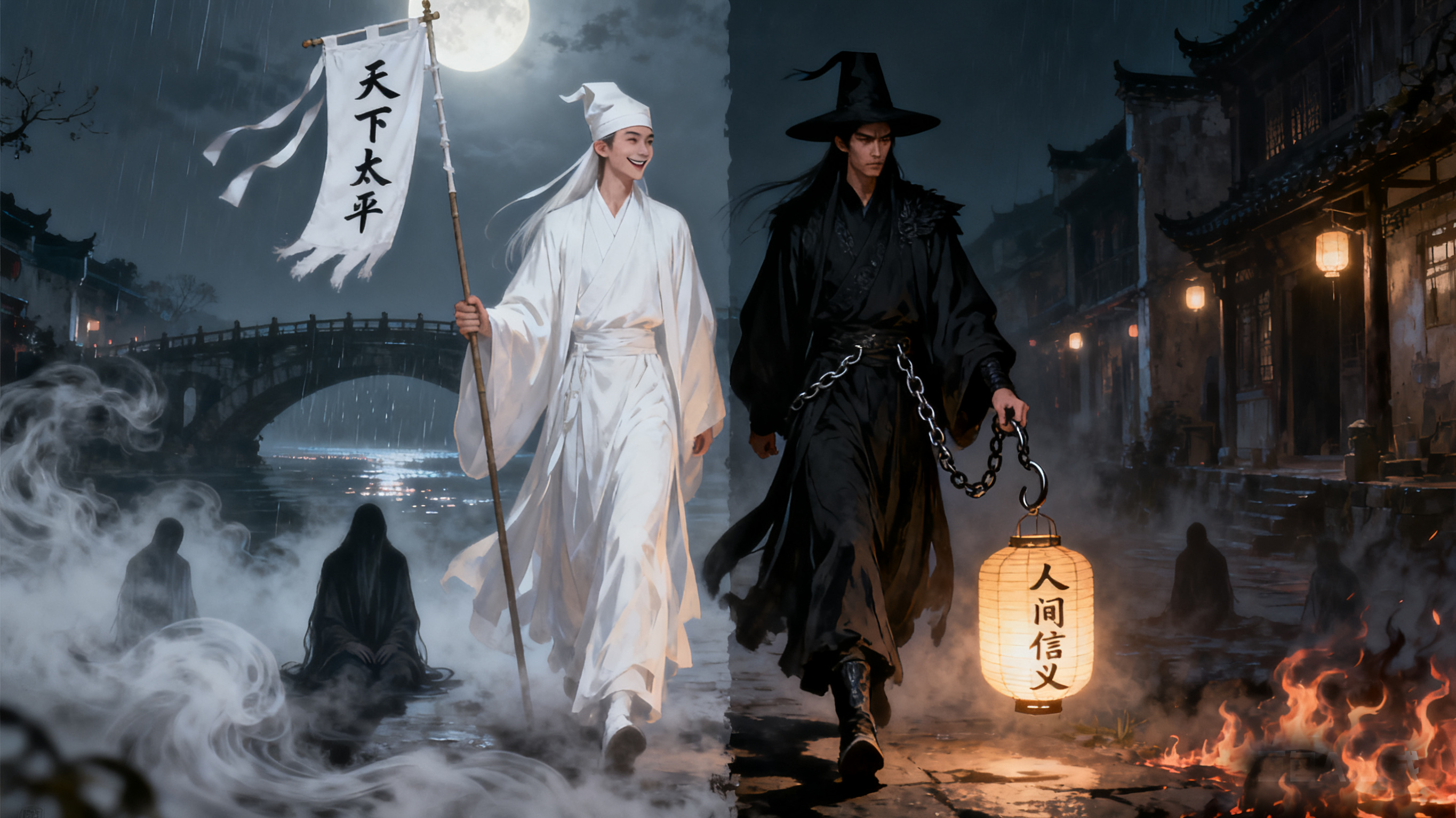 有说桥边常见白身黑影一长一短,前者笑颜,后者肃面,巡夜而行。见善者拂袖安抚,见恶者冷目拘魂。人称——“白黑无常,信义二使。”