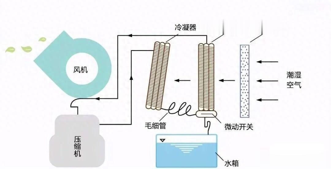 简单来说,就是通过风机将潮湿空气吸进机器,通过热交换系统把空气中的水分冷凝成水珠,然后将处理过后的干燥空气排出机器外,通过空气循环降低相对湿度。