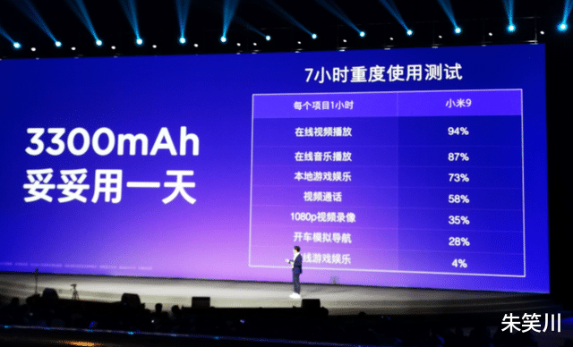 当年的小米 9,为了极致轻薄的手感,在旗舰机普遍迈入 4000mAh 电池的时代,只塞进了一块 3300mAh 的电池。为了打消用户的顾虑,发布会上雷军放出了 7 小时重度使用测试剩余 4% 电量的数据,掷地有声地给出了 “妥妥用一天” 的承诺,高管林斌更是直言,凭借系统优化,这款 3300mAh 的机型,续航比友商 4200mAh 的旗舰还要好。