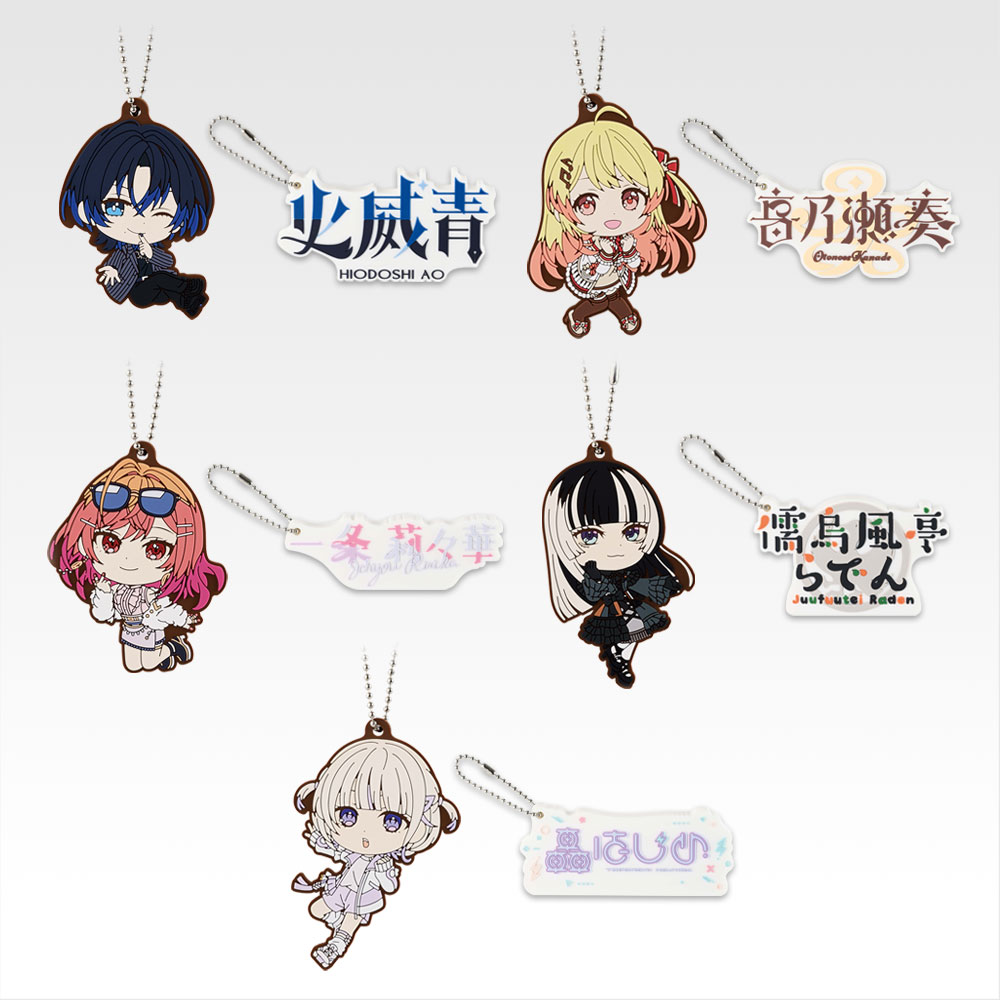 这款橡胶吊饰,把 ReGLOSS 的陪伴感 “随身携带”!造型上是 Q 版蹲姿设计,每一款都对应成员的人设名场面:火威蓝的插兜耍帅蹲、音乃濑奏的抱留声机元气蹲、一条梨花的抱狗甜辣蹲、儒乌风亭らでん的优雅蹲、轰肇的麦克风甜笑蹲,可爱又有辨识度。