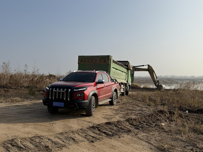 为了体验江淮悍途更多的适用场景笔者也将其开到真实的工地和农田等场景进行体验。首先我们来到一处位于河边的施工场地,条件较为严苛且主要为非铺装路段,该路段对于微卡、小卡等车型难度较大,而对于江淮悍途来说则没有丝毫压力。