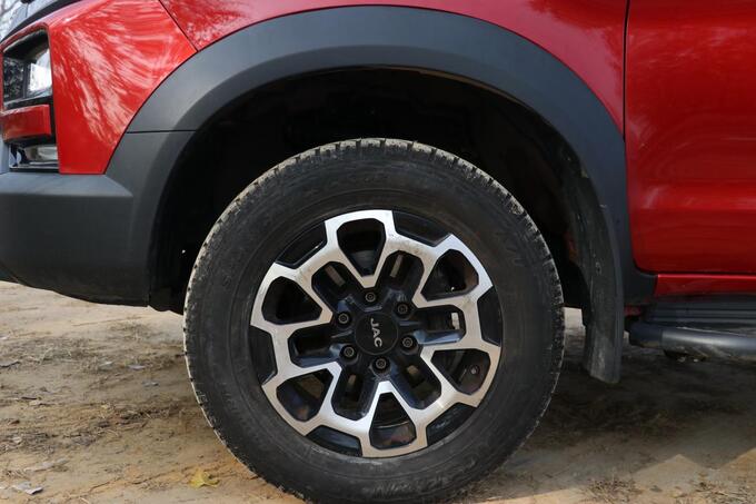 另外需要关注的便是江淮悍途的轮胎,作为整车唯一与地面接触的配置,再强的动力和底盘没有优秀的轮胎也无法发挥实力。江淮悍途原厂配备265/65 R18的大尺寸车轮以及造型新潮的花瓣式龙鳞轮毂,更宽的轮胎便为其带来了出色的抓地力,可以更好的发挥强劲动力,而相比后期夸张改装的过大尺寸轮胎,原厂265宽度也能保证了较为经济的油耗表现。试驾过程中部分路段较为湿滑,但其也未出现打滑现象,做到了兼顾驾驶感受和安全性。