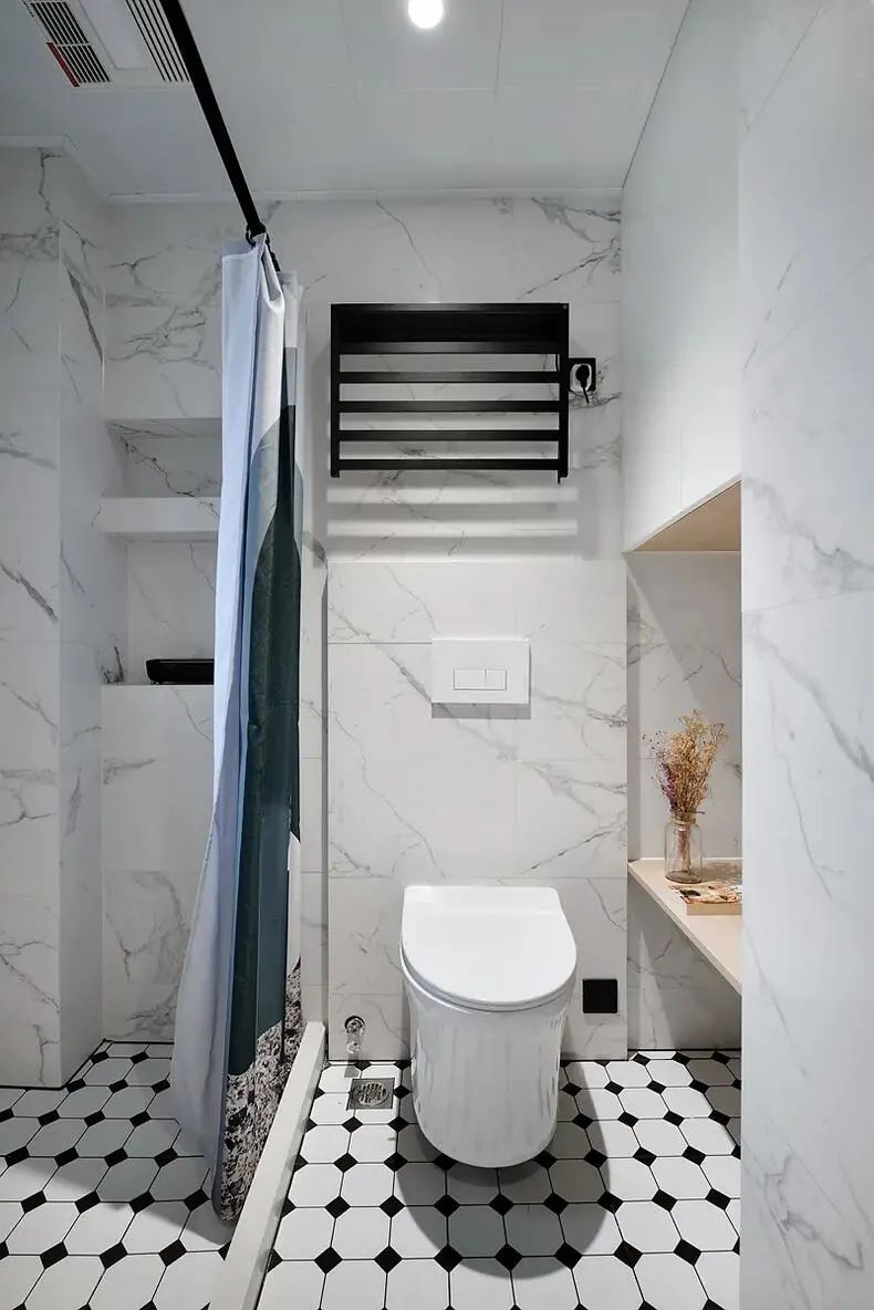 卫生间内部采用浴帘、挡水条将淋浴区与马桶分隔,做了简单的干湿分离。壁龛、吊柜与搁板的设计,增加了收纳空间。白色带花的大理石墙砖搭配黑白地砖,让空间更宽敞明亮,并没有小户型的压抑感。