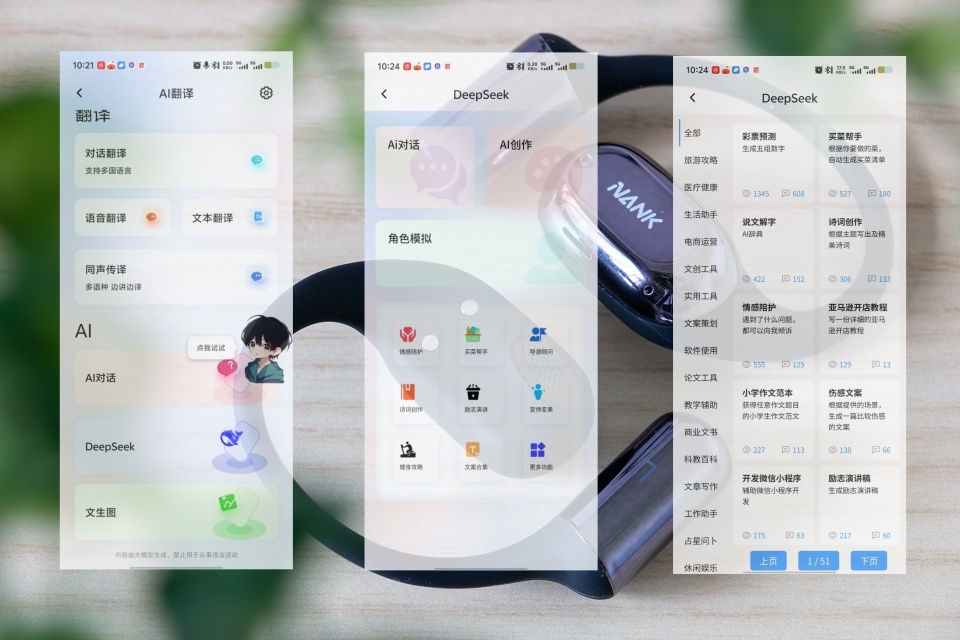 除了无感佩戴,卓越的音质,最令人心动的就是南卡OE Mix2的AI功能了。2025年被誉为AI爆发元年,已经逐步渗透到普通民众的日常生活中。南卡OE Mix2则让大众在使用AI层面更加便利。除了常规的对话,作图,翻译等功能,更嵌入了DeepSeek功能,使得用户在使用AI时候极为便利,只需打开对应的窗口,直接对话即可。