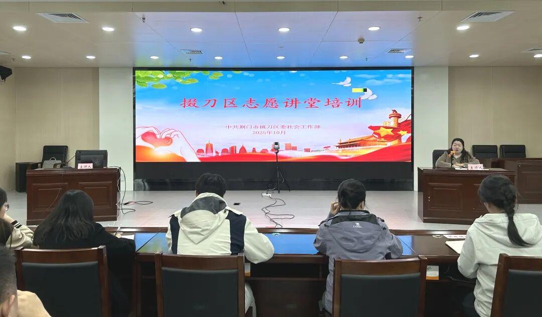 10月23日,荆门市掇刀区委社会工作部举办首期志愿讲堂培训。各镇(街道)分管负责人、区直单位代表、村(社区)志愿工作骨干等百余人参加培训。