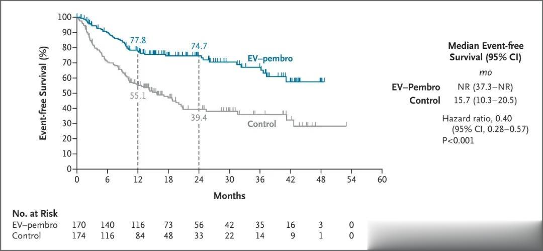 EV+K药组病理完全缓解率的优势也转化成了明显的生存优势。到数据截止时: