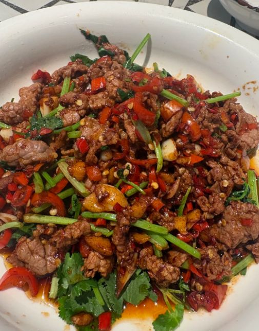 配菜是小米辣和杭椒,红红绿绿的,切成圈。大蒜拍碎,生姜切丝。锅烧到冒烟,下菜籽油,油温要高,油要多。牛肉下锅快速滑散,十几秒就变色,马上盛出来,不能炒老了。锅里留底油,下姜蒜和辣椒圈爆香,辣椒要炒到表皮起泡、辣味充分释放出来。然后把牛肉倒回锅里,加盐、生抽、蚝油、一点点糖提鲜,猛火快速翻炒几下,最后淋一圈锅边醋,激发出香味,立刻出锅。