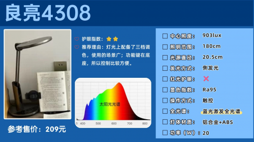 小学生护眼灯哪个牌子比较好呢?良亮4308护眼台灯采用漫射技术处理光线,照明效果较为柔和均匀,符合国AA级标准。它支持3000K至5000K的三档色温调节,并通过滑动触控方式调节亮度,操作比较直观。显色指数为Ra95,能较好还原物体色彩。功能上,配备了45分钟休息提醒和柔光小夜灯,满足基础使用需求。不过,其滑动调光操作的精准度一般,亮度的调节幅度也相对有限。