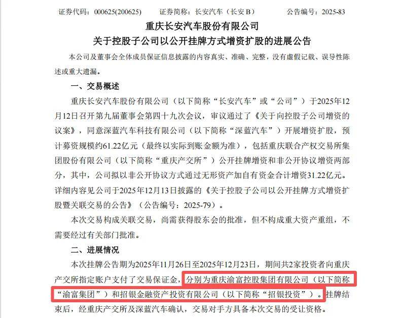 在这一轮融资中,重庆渝富控股集团有限公司增资金额25亿元,重庆长安汽车股份有限公司增资31.22亿元,招银金融资产投资有限公司增资5亿元,总计增资61.22亿元。