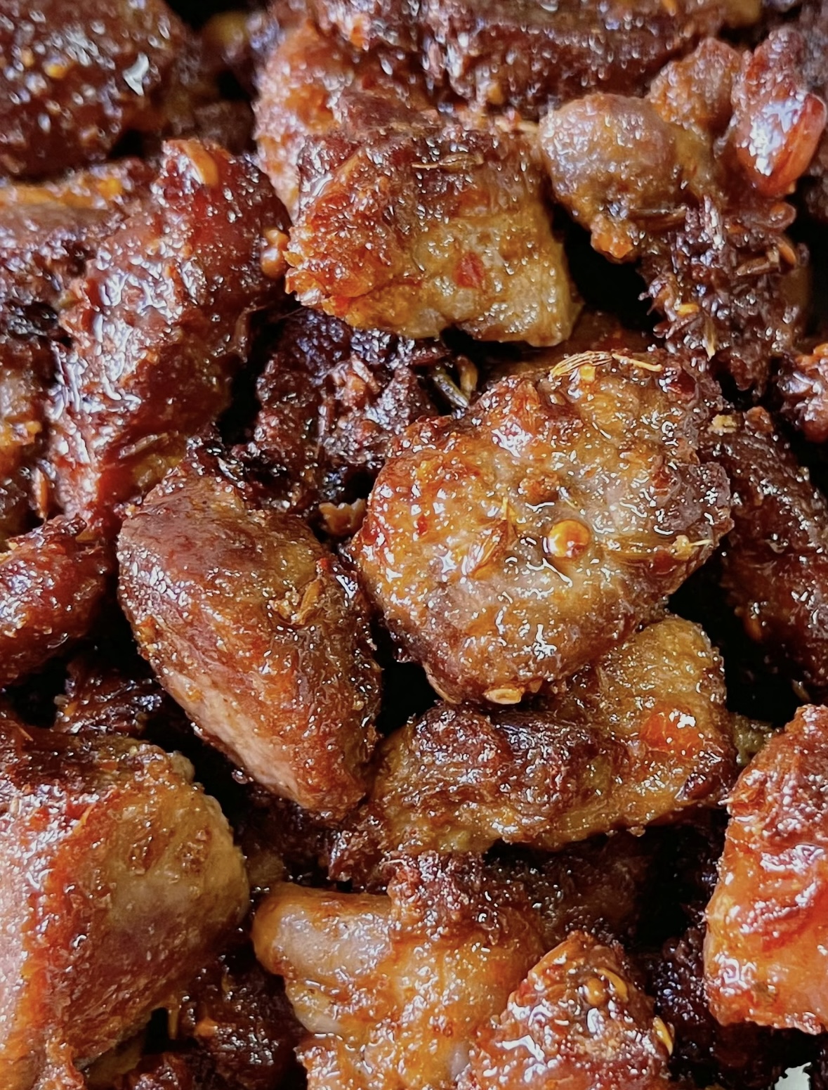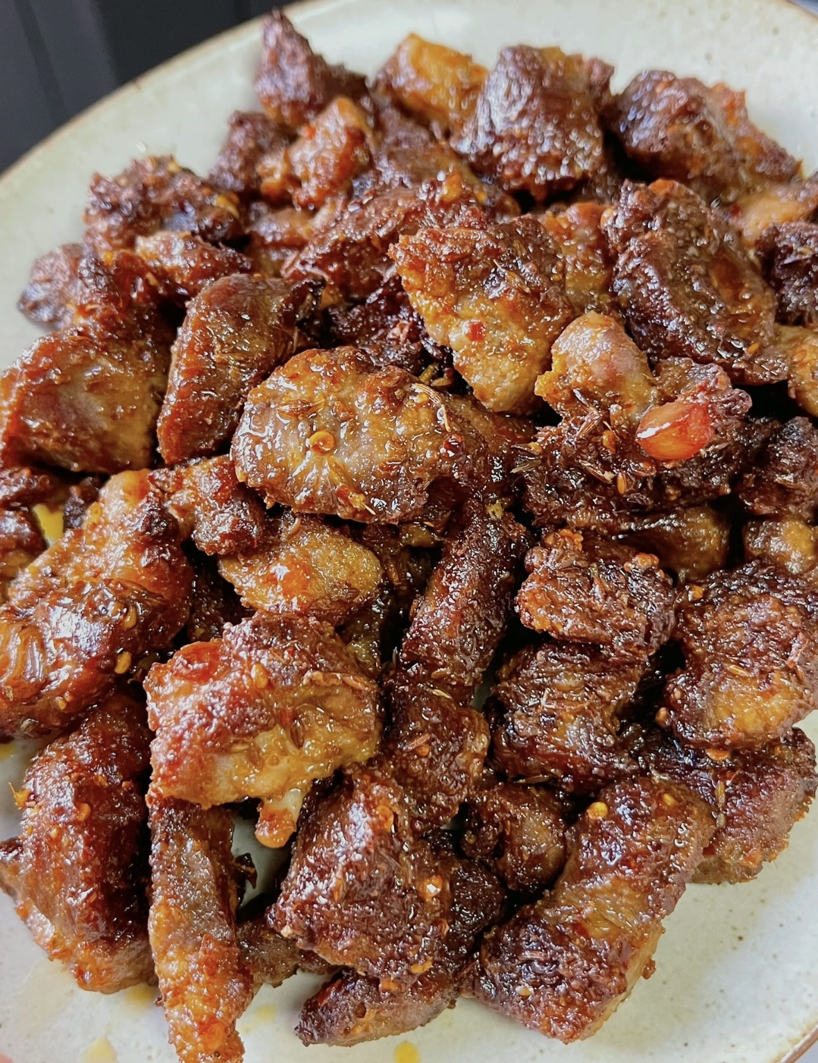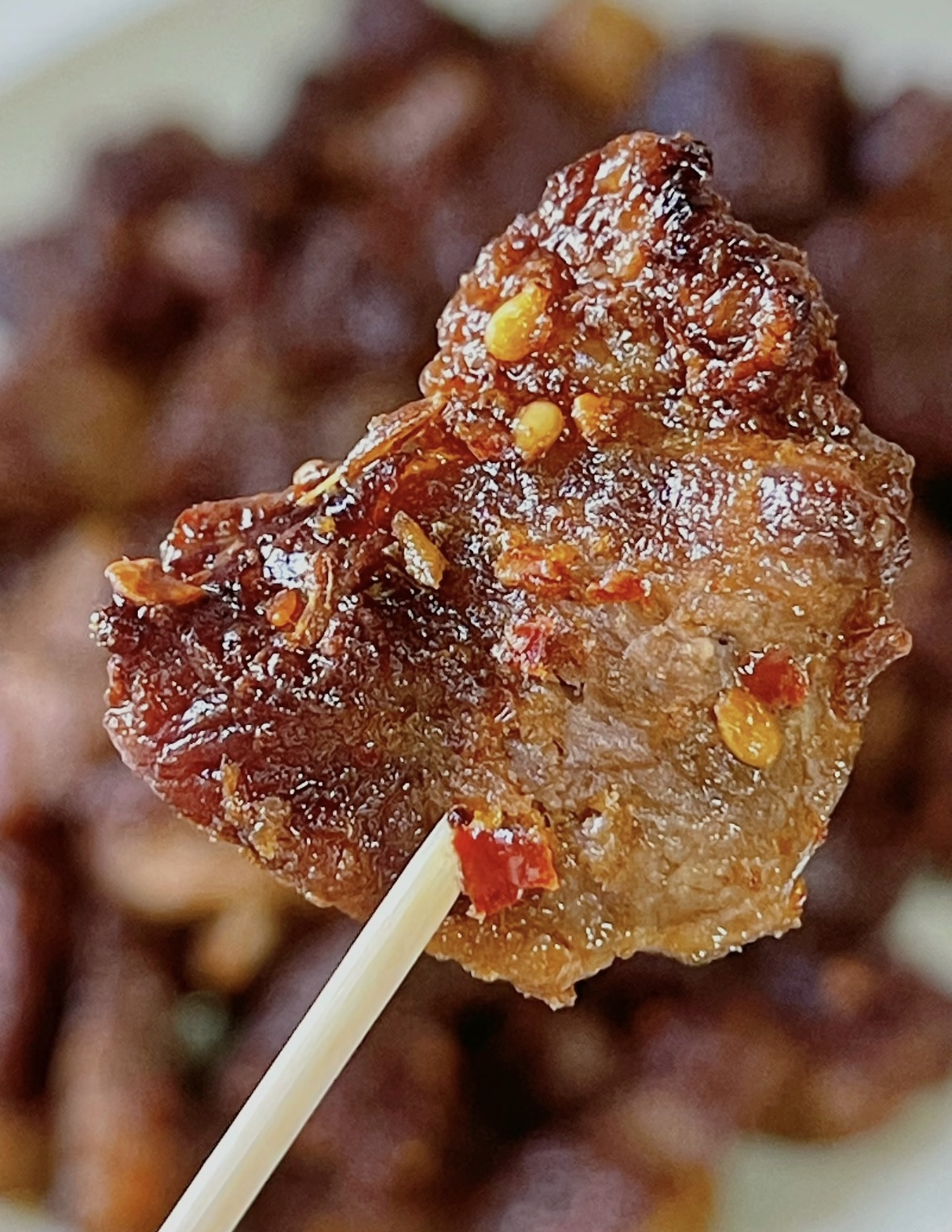 好戏开场!平底不粘锅上灶,中火空烧到微微冒烟,倒油别抠门,油量要能浅浅铺满锅底,让肉丁“半煎半炸”。油纹一出现,立刻下肉,平铺别堆叠,否则温度骤降,肉直接“水煮”。听到“滋——”那一声,请立即开启“甩锅”模式:用铲子轻轻推动,让每一面都均匀受热。大约90秒,肉丁边缘出现金黄“小裙子”,就翻面,再90秒,表面焦色加深,油脂被逼得晶莹剔透,这时候把提前配好的干料全倒进去,火调到最大,快速翻炒15秒,让高温把孜然和辣椒面激活,香气像烟花一样炸开。关火,再补一小撮孜然粒和芝麻,用余温逼香,成品立刻提升“街头烧烤魂”。