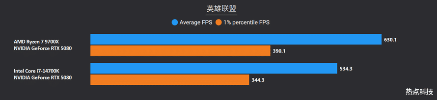 测试结果显示,9700X平均帧数为630.1,14700K平均帧数为534.3,9700X领先幅度为17%。1%Low帧差距则为13%。差距显然易见。