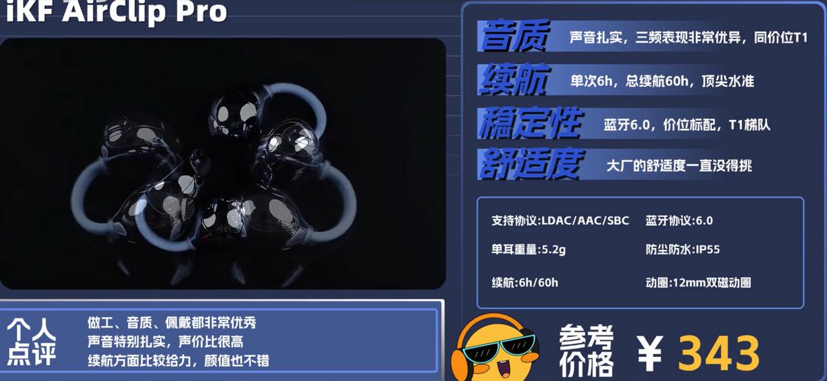 iKF AirClip Pro在这个价位里,优势很突出的就是续航。单次使用加上充电仓补电,总续航很长,经常出差、懒得频繁充电的人会很喜欢。12mm动圈配合高清编码,听感更饱满,看剧、听歌氛围感都不错,漏音控制也做得比较稳,日常通勤使用很合适,做工和佩戴舒适度也对得起价格。