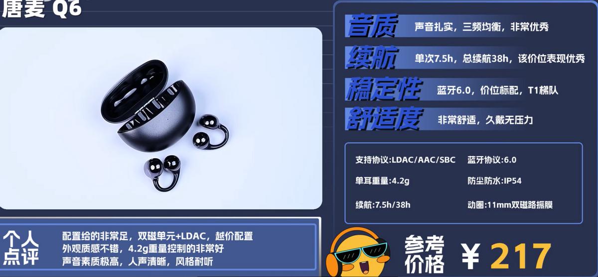 这个价位大多是入门体验款,不用追求多高端的功能,佩戴舒服、音质不崩、续航够用就已经很合格。单耳轻到像没戴,戴一下午耳朵也不发红、不夹痛;LDAC高清编码+11mm振膜,音质不发闷、不轰头,日常听歌、上网课、刷短视频完全够用,颜值也在线~续航也很抗打,单次7.5h、总续航38h,偶尔运动、短途出门,防水防尘也能hold住,百元价位能做到这样,真的血赚不亏,闭眼冲就完事儿!