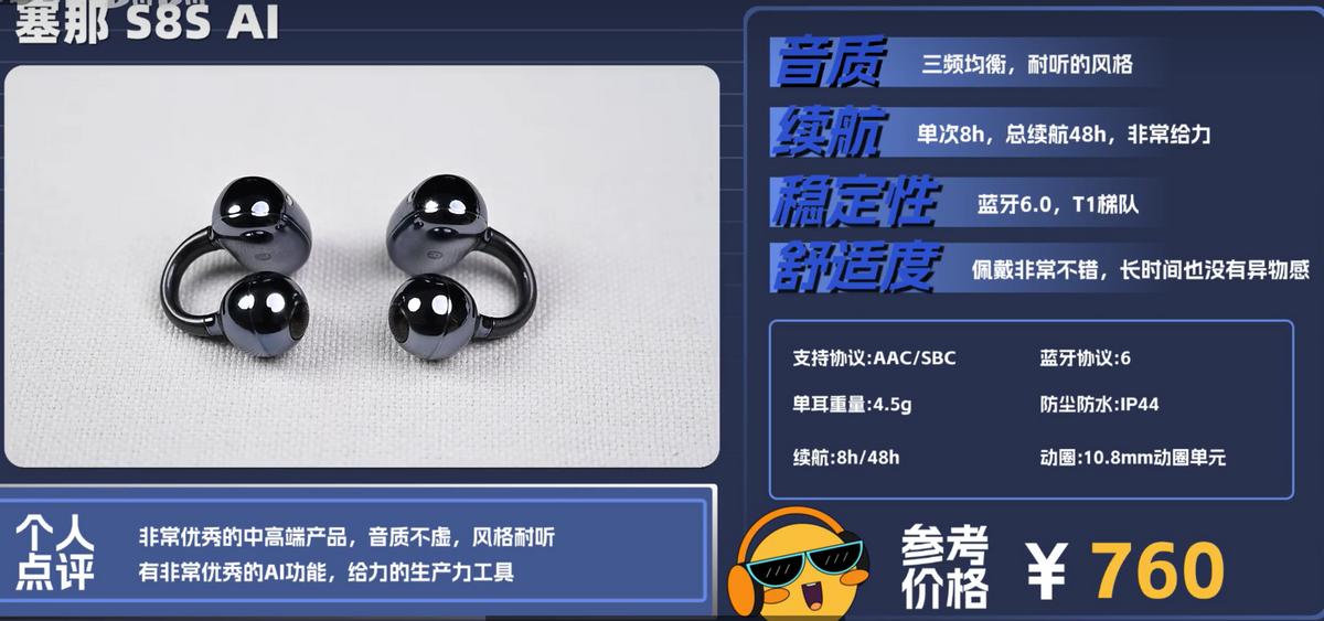 塞那S8S AI整体风格偏均衡耐听,长时间听也不容易累,续航足够支撑一整天工作。它的核心亮点是AI相关功能,实时翻译、语音转写、会议纪要等,对职场人来说实用性很高,开会不用再手忙脚乱记重点。虽然防水等级不算突出,但在办公室、室内场景完全够用,更适合注重效率的商务用户。