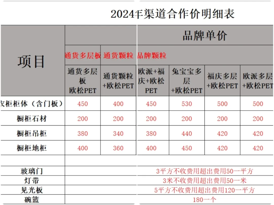 ▲今年经济下行,定制厂商尤其内卷,上图为当前定制柜板材品牌与公司的合作价格,普通客户不一定能拿到,业主去买会正常上浮50-100元左右一平方,这是正常的市场价,可以衡量自己是否买贵。