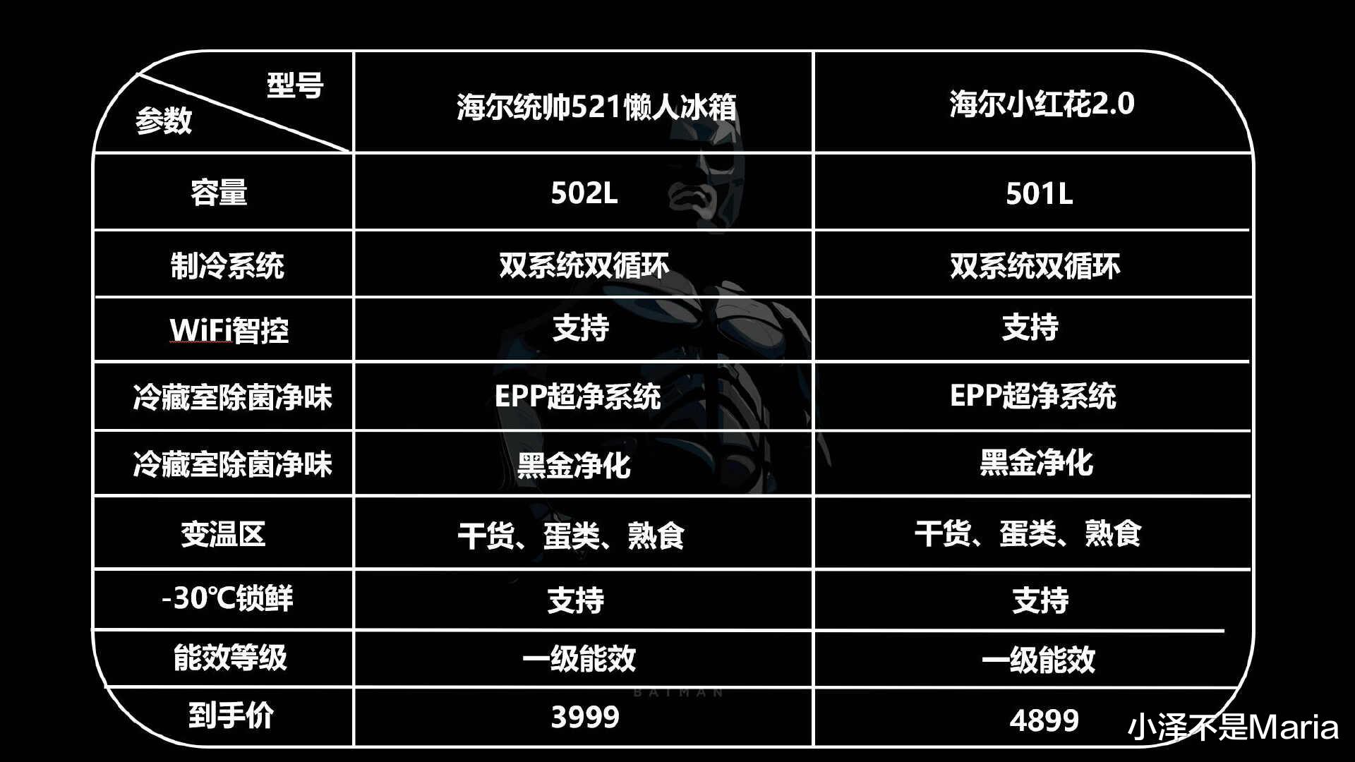 在对比过程中我就发现,海尔统帅521跟海尔旗下当红的冰箱小红花2.0相比,两者的配置功能上几乎就是一模一样,但售价却足足相差了1000多元。还好我买之前做了对比,才没有多花冤枉钱,具体的参数呢,我也帮大家整理在表格里了,那功课我来做,换个大家的一键三连不过分吧。